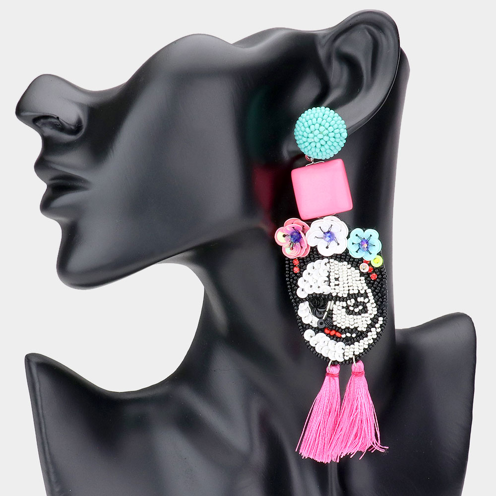 Triple Flower Sequin Seed Beaded Skull Tassel Link Dangle Earrings