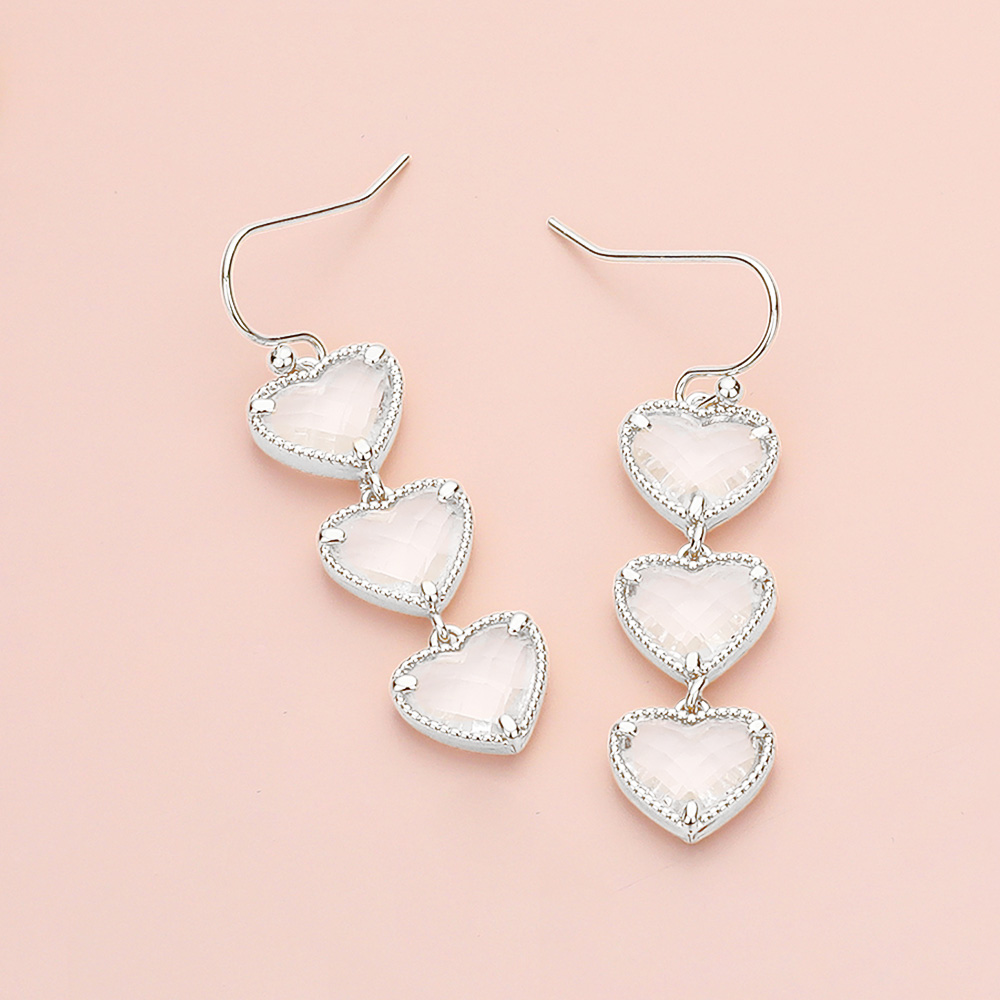 Details • Size : 0.4" X 1.8" • Fish Hook Back • Chic triple heart drop earrings with faceted stones. Lightweight and stylish, perfect for adding a romantic and modern touch to your everyday or evening look. • Lead and Nickel Compliant • Brass