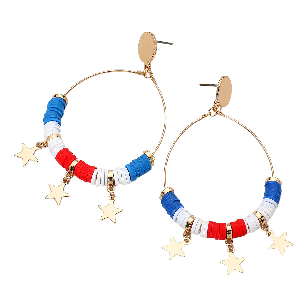 Details • Size : 1.75" X 3.2" • Post Back • Festive hoop earrings with disc beads and dangling star charms. Perfect for holiday outfits, themed parties, or adding playful flair to your everyday look. Lightweight and eye-catching. • Lead and Nickel Compliant