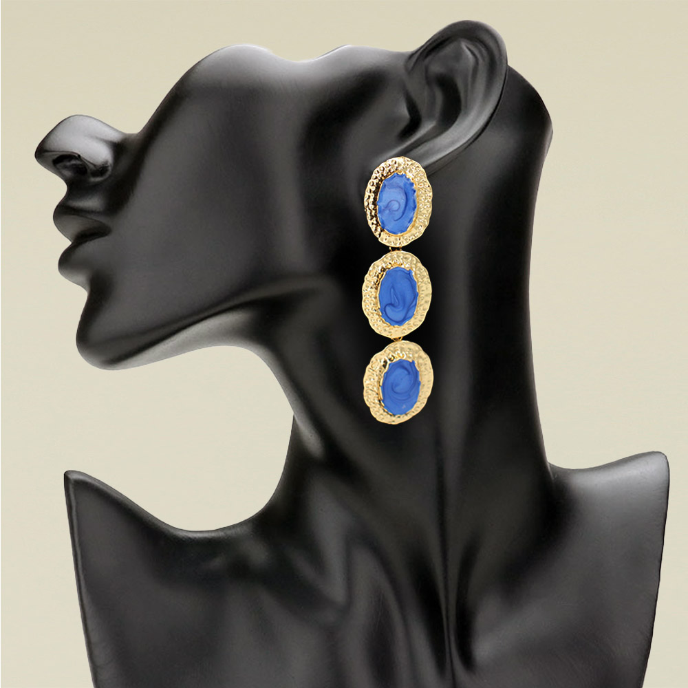 Details • Size : 0.75" X 3.25" • Post Back • Stylish triple oval drop earrings featuring marbled oval centers framed by textured metallic borders. The cascading design adds a touch of modern elegance, perfect for dressing up any outfit. Lightweight yet striking, ideal for parties, special events, or chic everyday wear. • Lead and Nickel Compliant