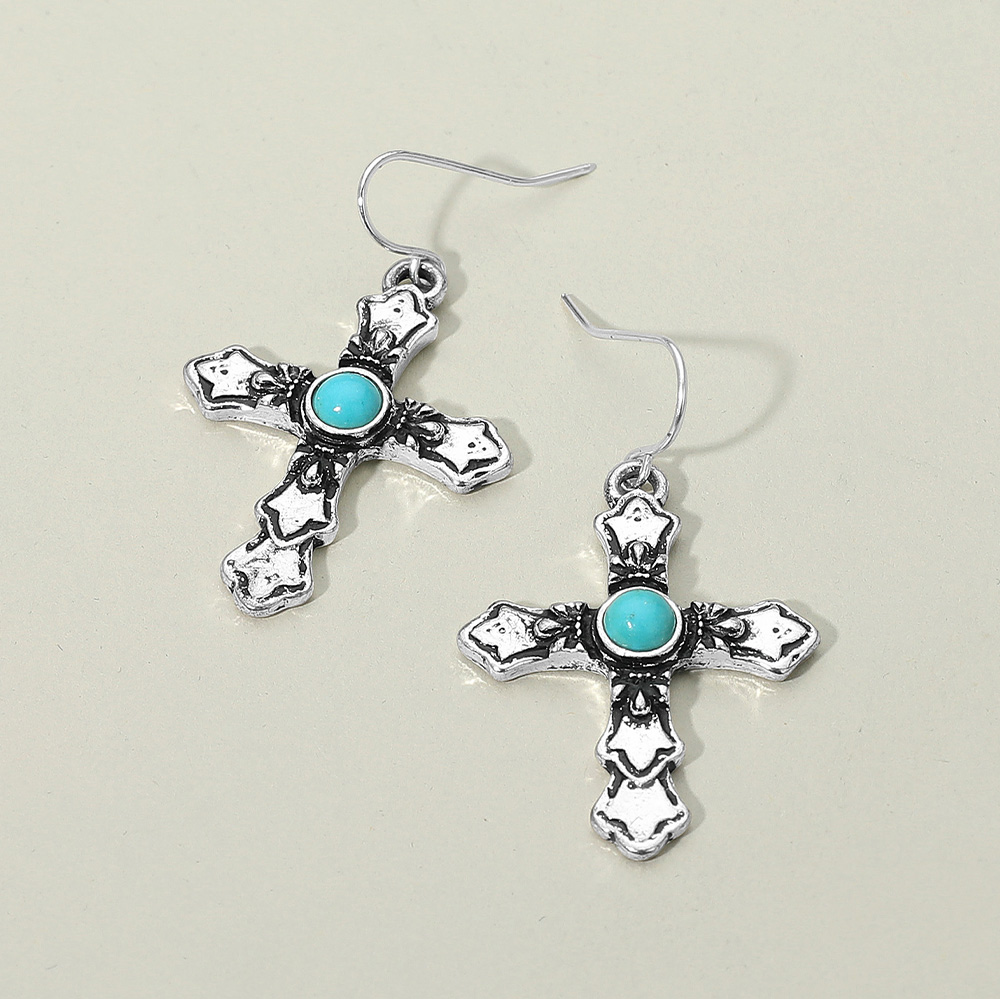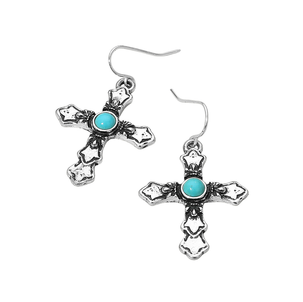 Details • Size : 1" X 1.75" • Fish Hook Back • Add a touch of timeless elegance with these vintage cross drop earrings. Featuring ornate detailing and a vibrant center accent, they combine classic charm with bold sophistication—perfect for adding a statement finish to both casual and dressy looks. • Lead and Nickel Compliant