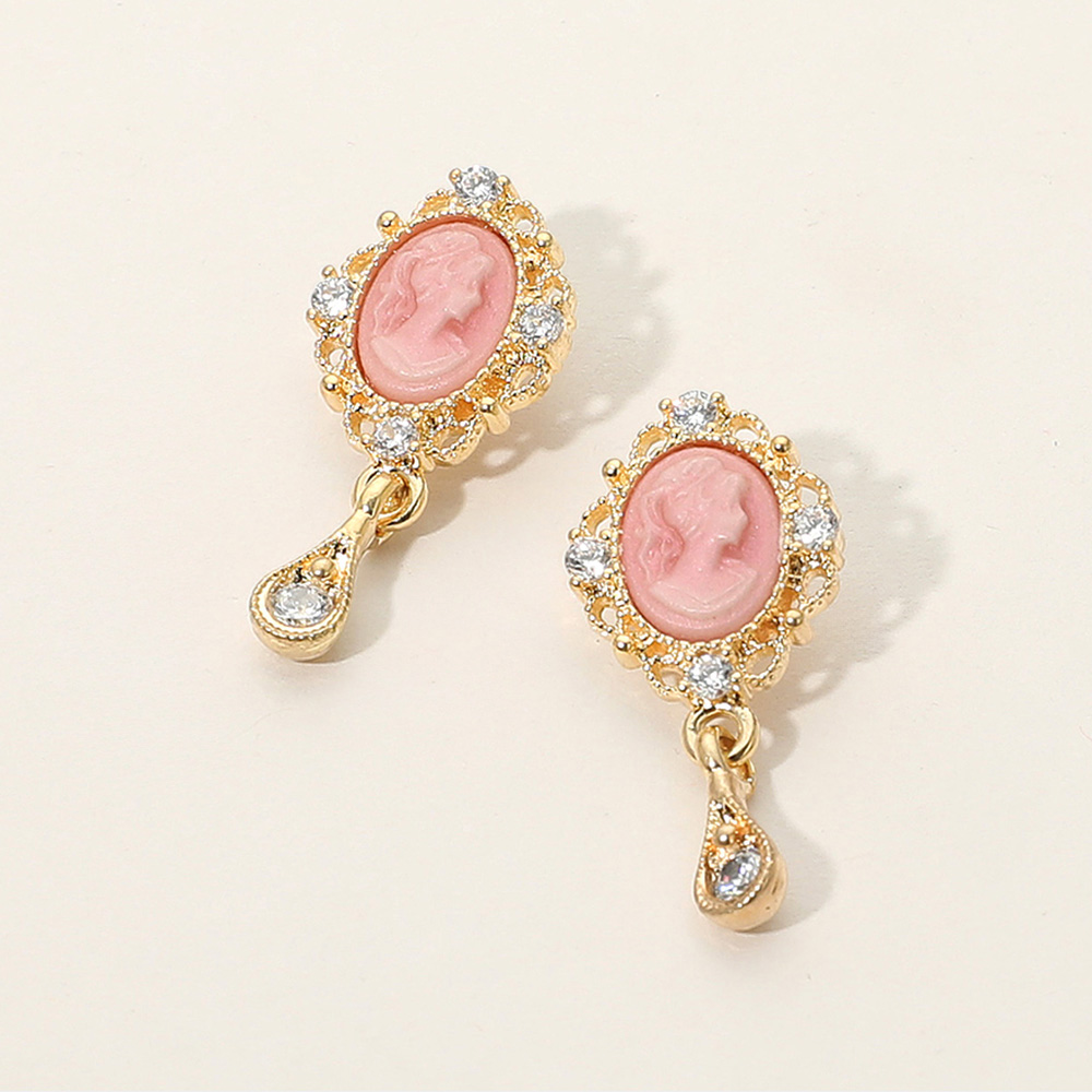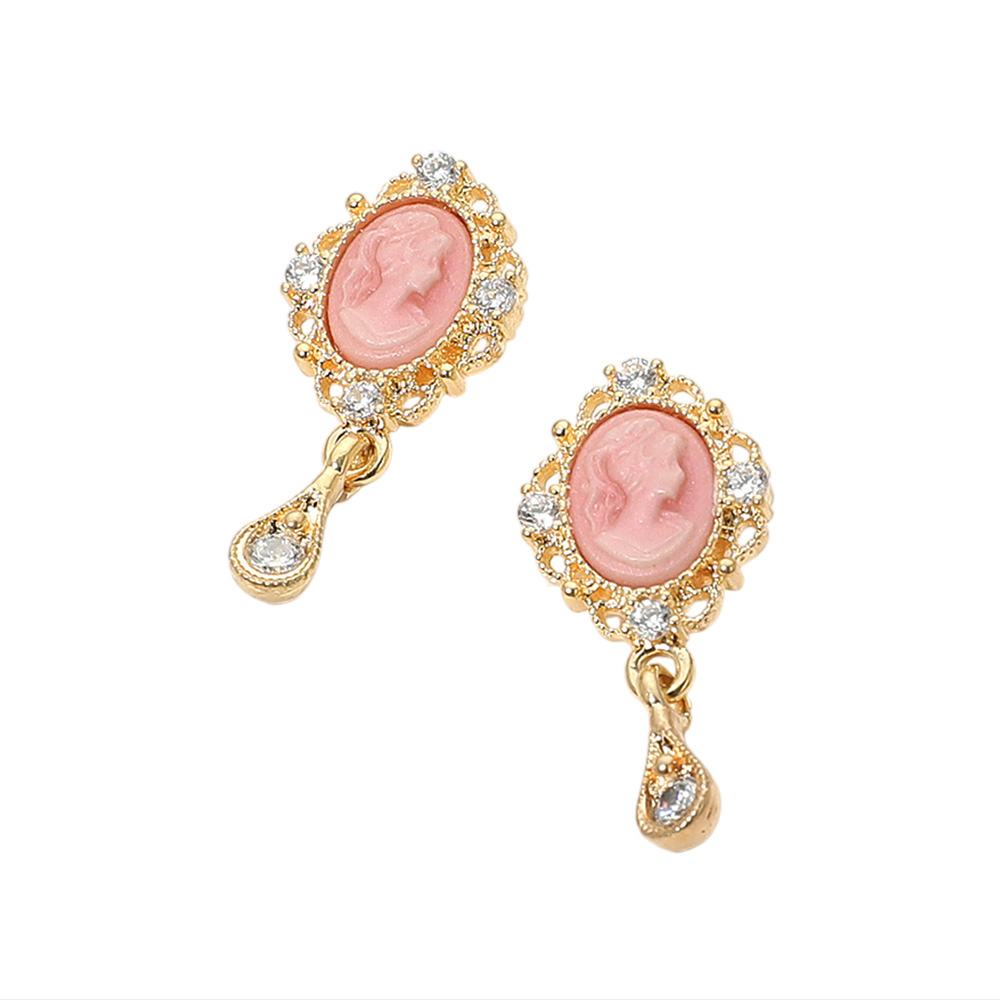 • Charming vintage-inspired cameo earrings featuring pink portrait centers framed with sparkling crystals and delicate teardrop accents. A timeless accessory that adds elegance and sophistication to any outfit or occasion.