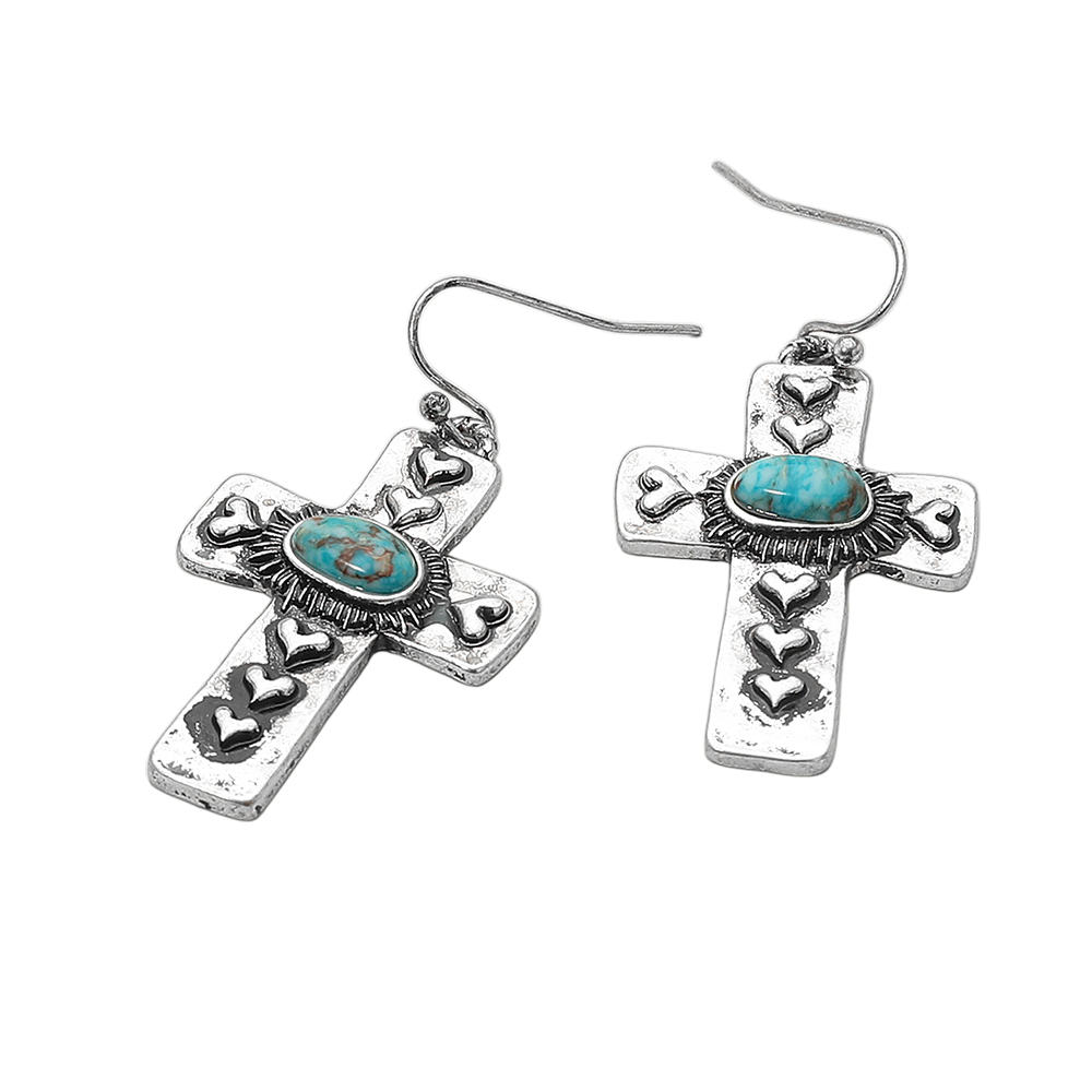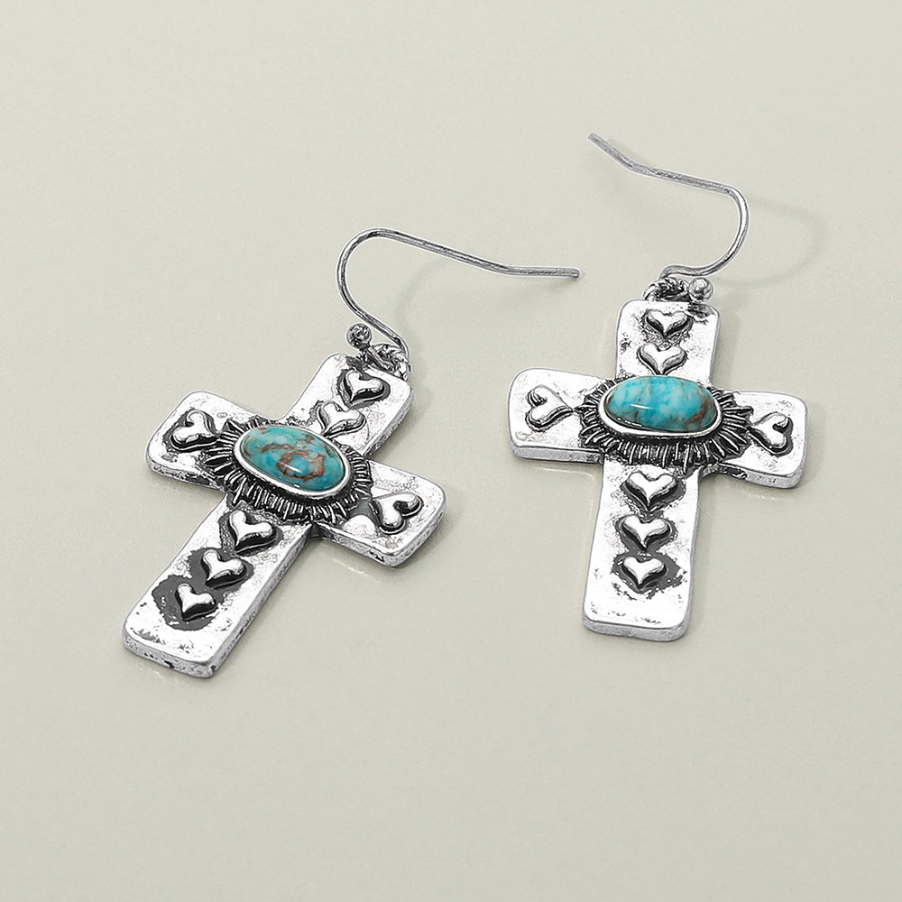 Details • Size : 1" X 1.75" • Fish Hook Back • Statement drop earrings featuring bold cross shapes adorned with heart details and a central stone accent. A unique design blending symbolic meaning and striking style, perfect for everyday wear or special occasions. • Lead and Nickel Compliant