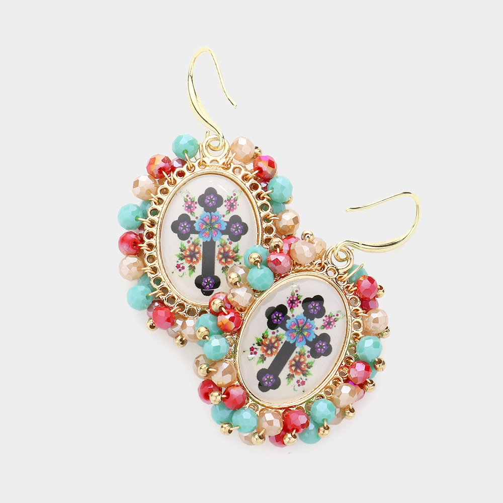 Virgin Mary Cross Printed Faceted Bead Cluster Dangle Earrings