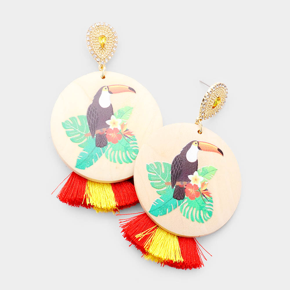 Water Color Toucan Round Wood Tassel Earrings