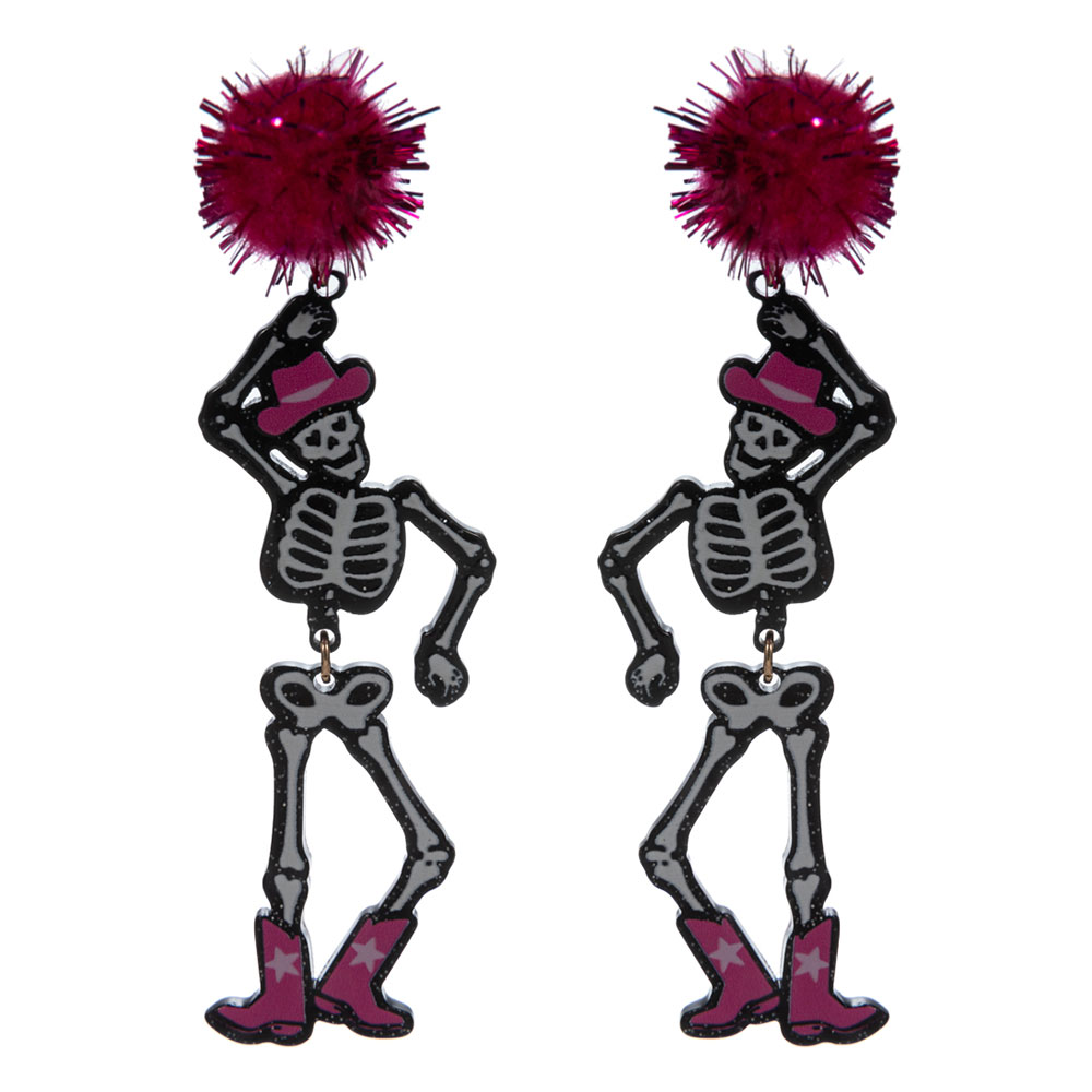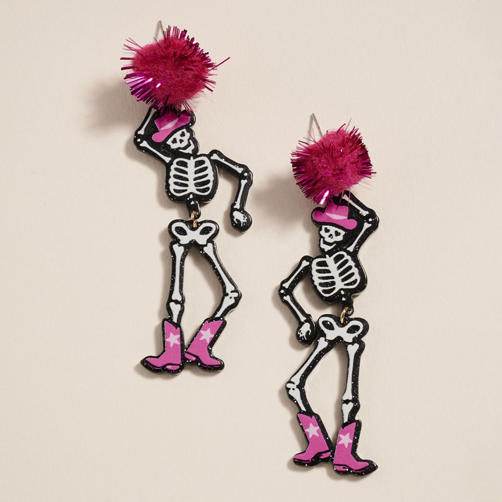 Western Cowboy Halloween Pom Pom Skeleton Earrings