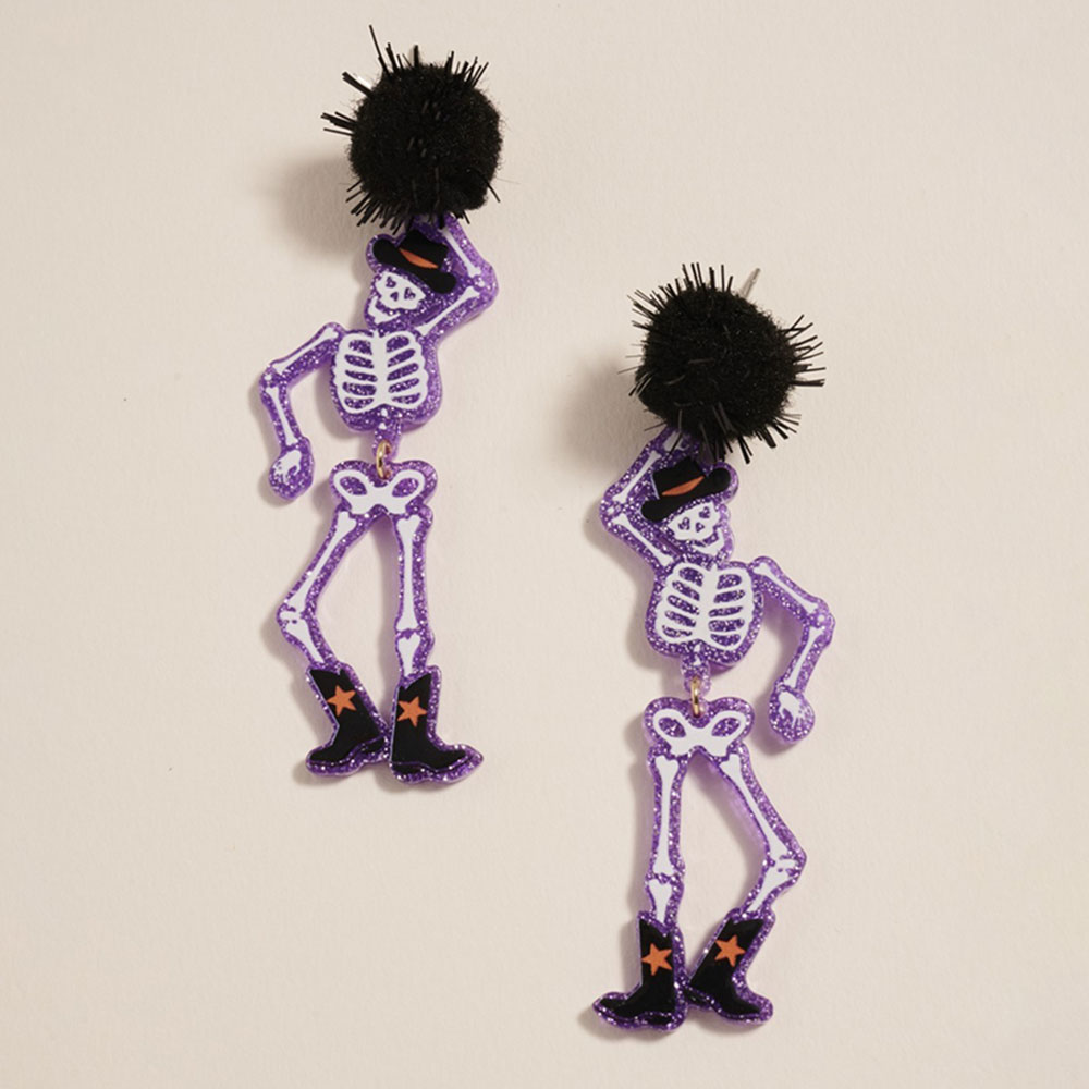 • Add playful fright to your outfit with these Halloween-themed earrings featuring a dancing skeleton in festive boots and hat. Topped with a textured pom-pom for extra flair, these statement earrings bring spooky fun to costume parties, seasonal events, or themed nights out.