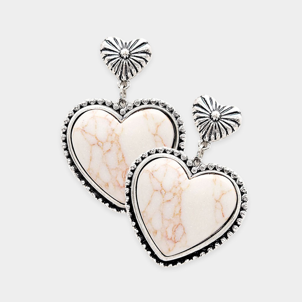 • These heart drop earrings feature a faux marble center with bold Western-inspired detailing and textured stud tops. Perfect for adding vintage charm to any outfit, they’re ideal for casual wear, themed events, or as a standout accessory with rustic flair.