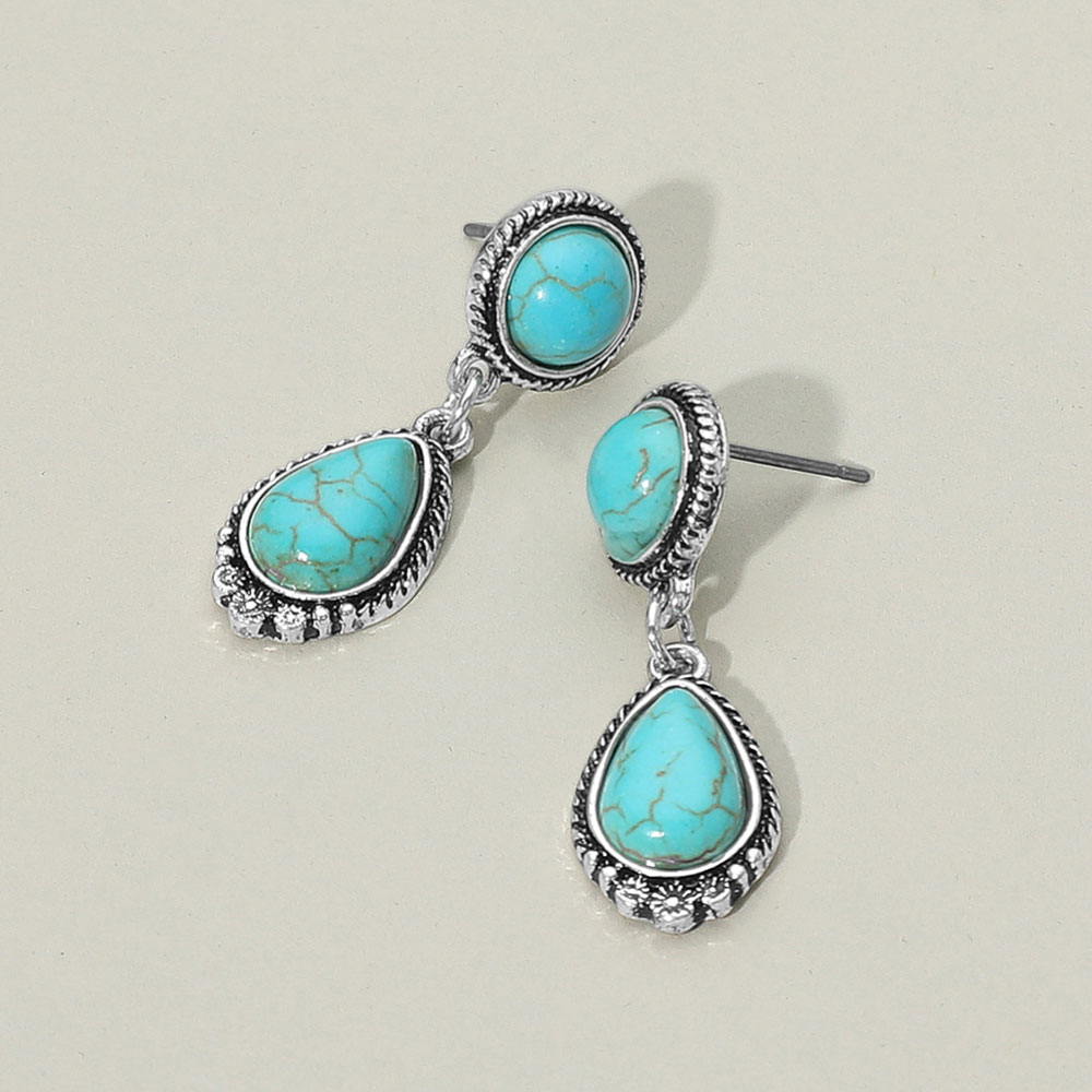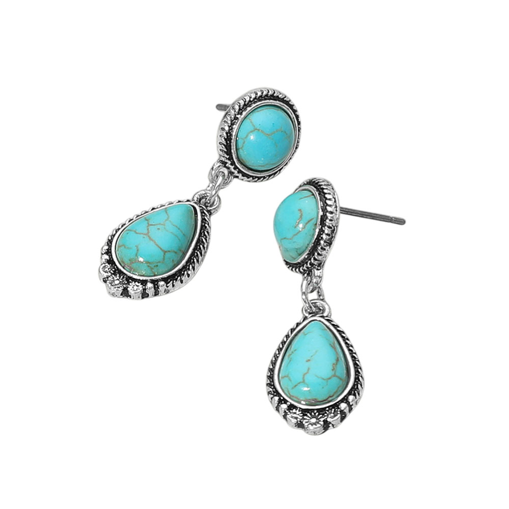 Details • Size : 0.5" X 1.3" • Post Back • Elevate your look with these vintage-inspired drop earrings featuring dual teardrop stones and intricate metalwork. A bold yet timeless accessory that adds character to both casual and dressy outfits. • Lead and Nickel Compliant
