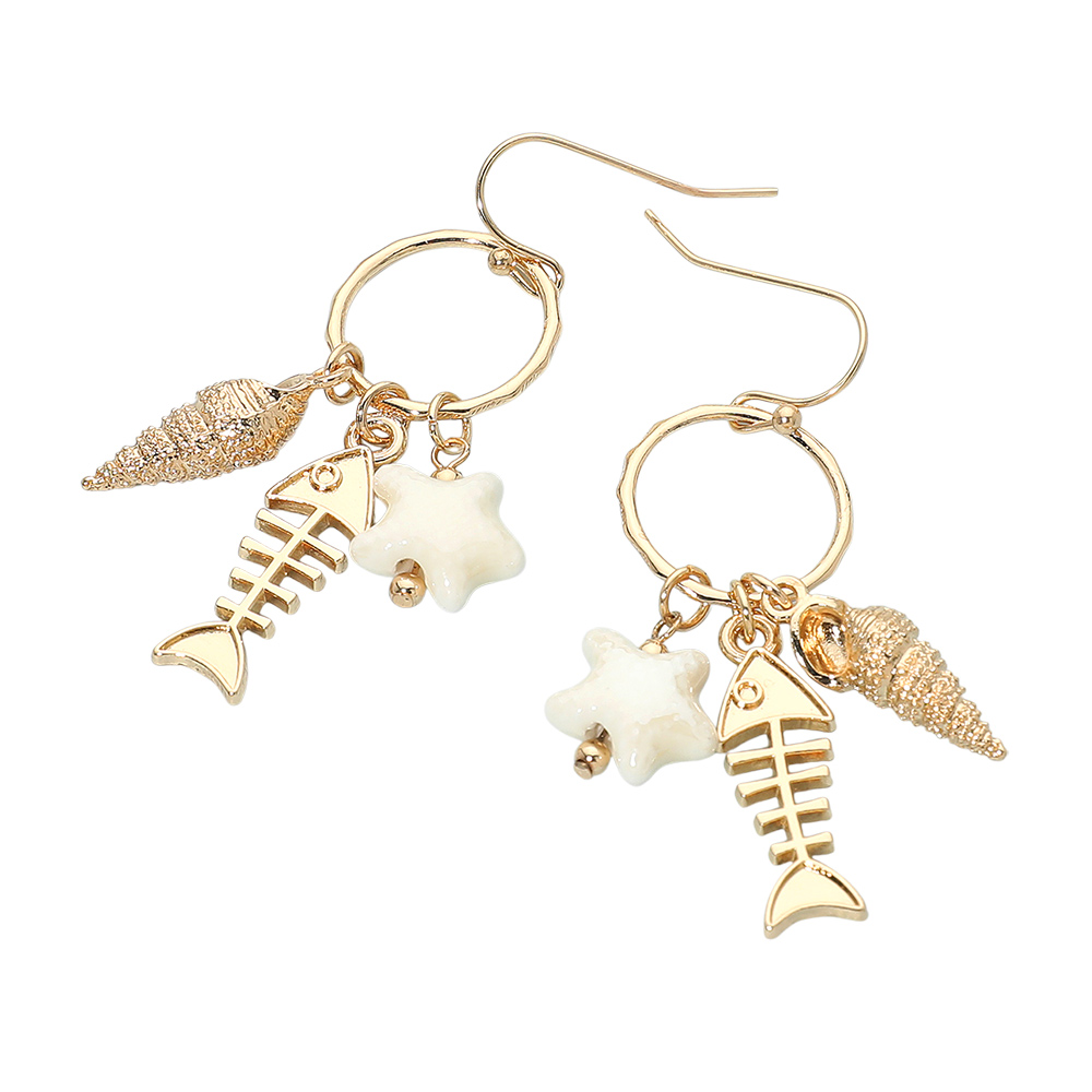 Details • Size : 1" X 2.1" • Fish Hook Back • These ocean-inspired charm earrings feature playful dangling elements that evoke a lighthearted coastal vibe. Their unique mix of shapes creates a fun, expressive look perfect for adding personality to casual outfits or enhancing a breezy, beach-themed style. • Lead and Nickel Compliant