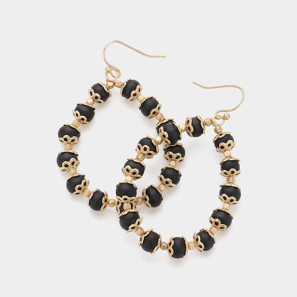Wood Ball Beaded Open Teardrop Dangle Earrings