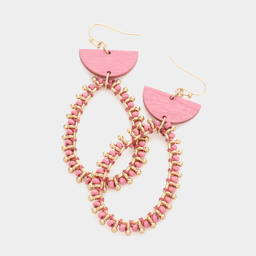 Wood Ball Wrapped Open Teardrop Dangle Earrings