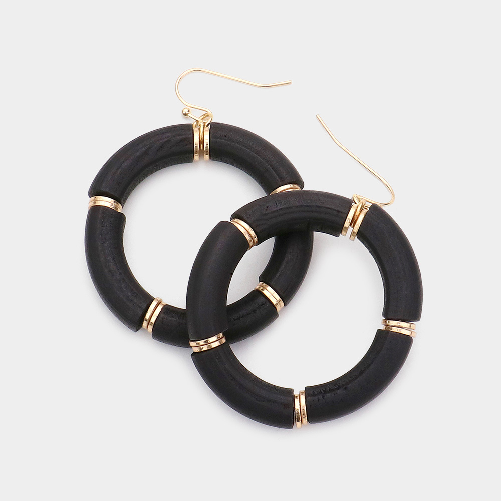 Faceted Bead Wrapped Open Wood Circle Dangle Earrings