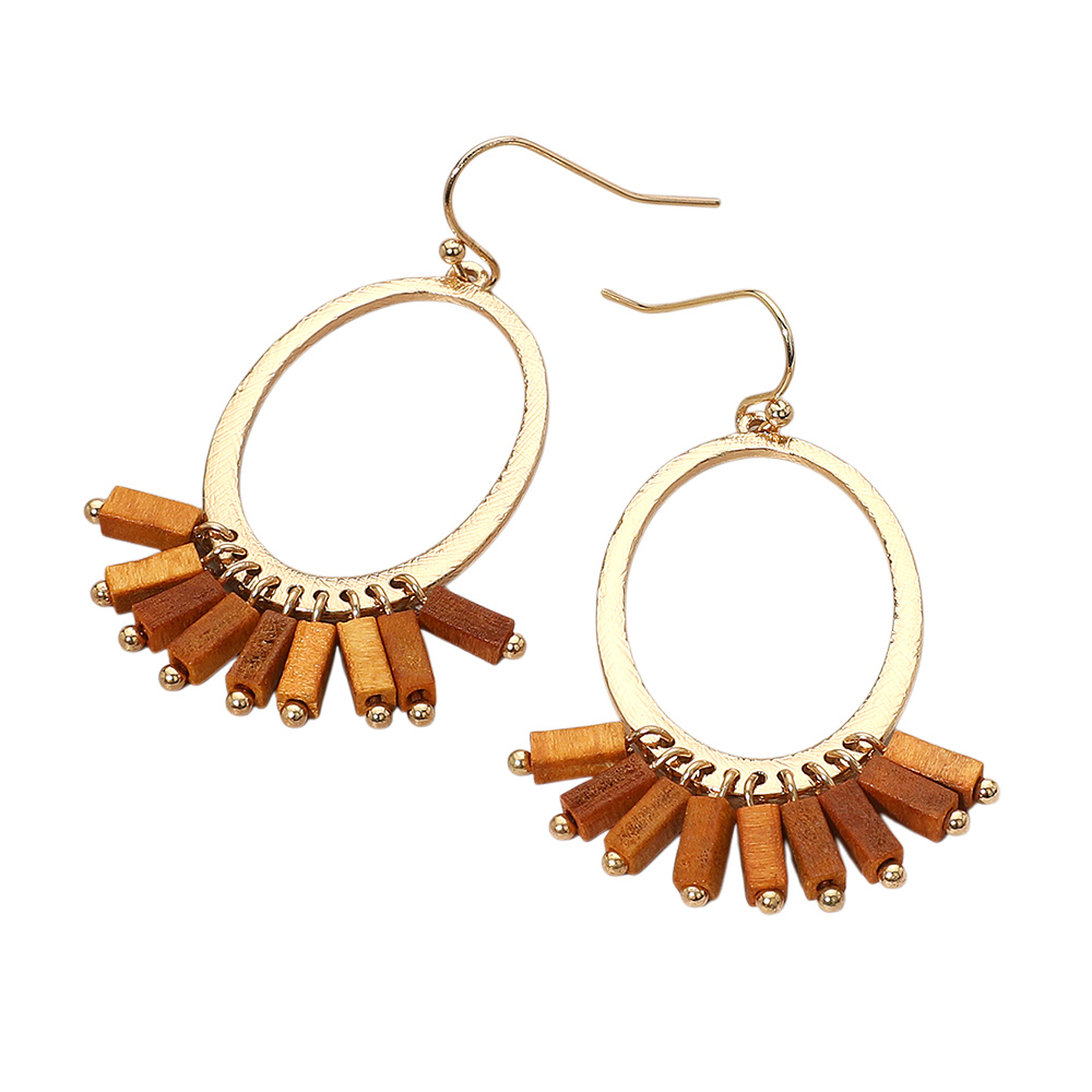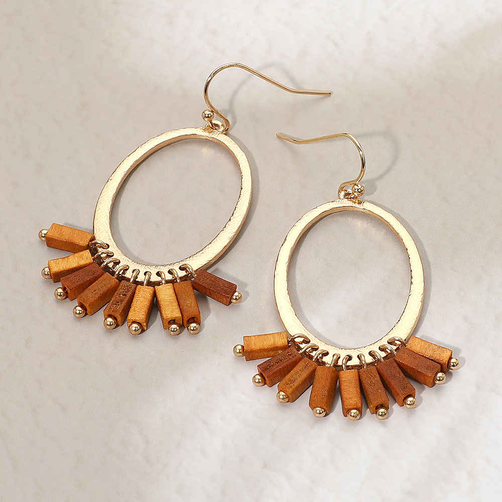 Wooden Charm Hanging Open Oval Dangle Earrings
