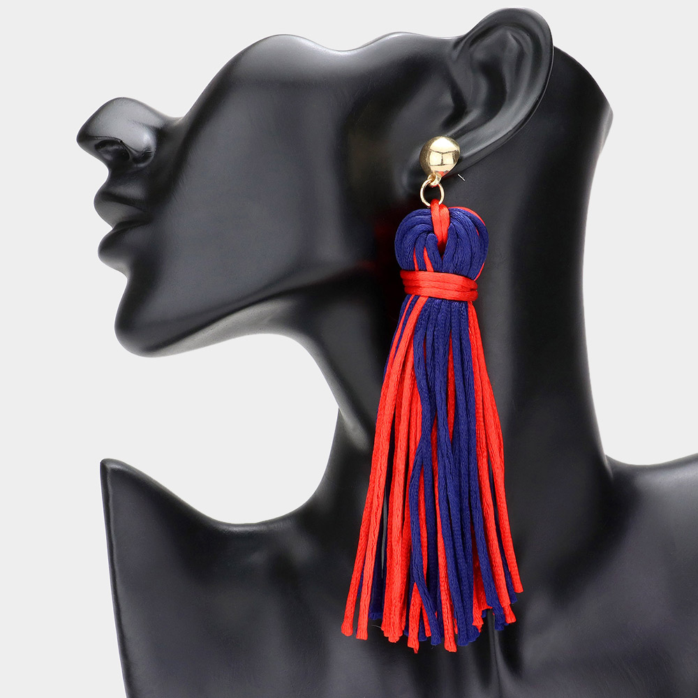 Details • Size : 2" X 5.8" • Post Back • Cheer in style with these gameday tassel earrings, featuring bold colors that show off your team spirit while adding a fashionable flair. Lightweight and fun, they’re the perfect accessory for tailgates, stadium outings, or any sports fan looking to stand out on game day. • Lead and Nickel Compliant