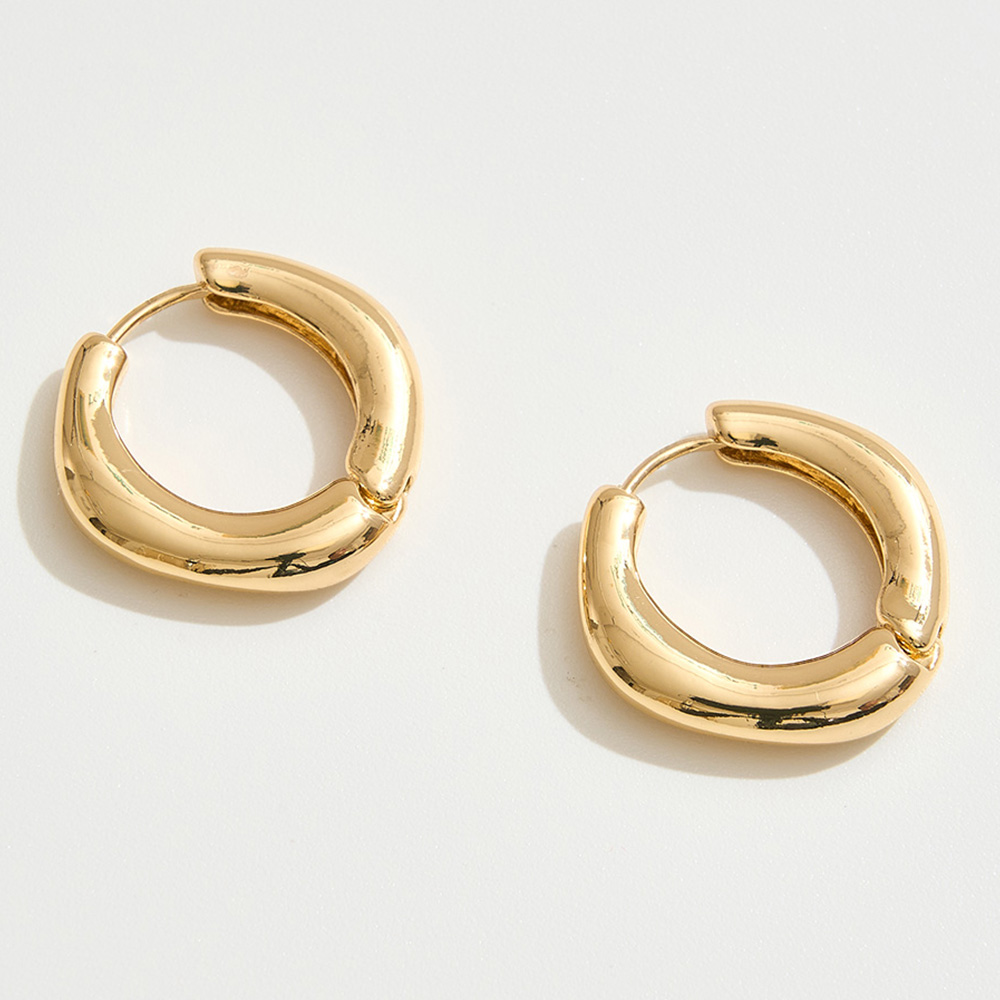 Details • Size : 1" X 1" • Huggie Back • Bold yet minimal, these rounded chunky hoop earrings feature a smooth, curved design that delivers timeless appeal. Lightweight and versatile, they make the perfect go-to accessory for adding a touch of effortless polish to casual looks or elevating chic evening ensembles. • Brass • Gold Dipped • Hypoallergenic • Lead and Nickel Compliant • Made In Korea
