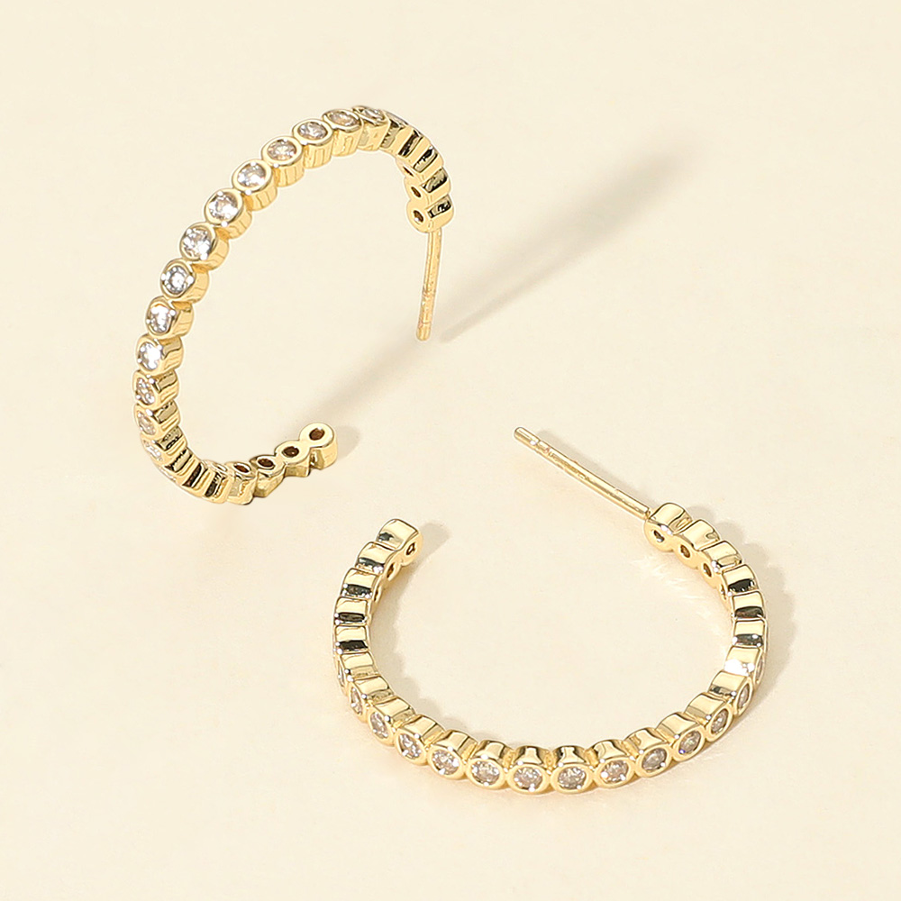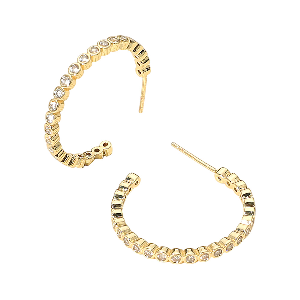 Details • Size : 1" X 1" X 0.1" • Post Back • Elegant hoop earrings featuring bezel-set crystals for a continuous sparkle effect. Their sleek and versatile design makes them perfect for day-to-night wear, adding sophistication to both casual and formal outfits. A timeless jewelry staple that enhances every style with a refined touch of brilliance. • Lead and Nickel Compliant • Hypoallergenic • Made In Korea • Gold Dipped • Brass • CZ Cubic Zirconia