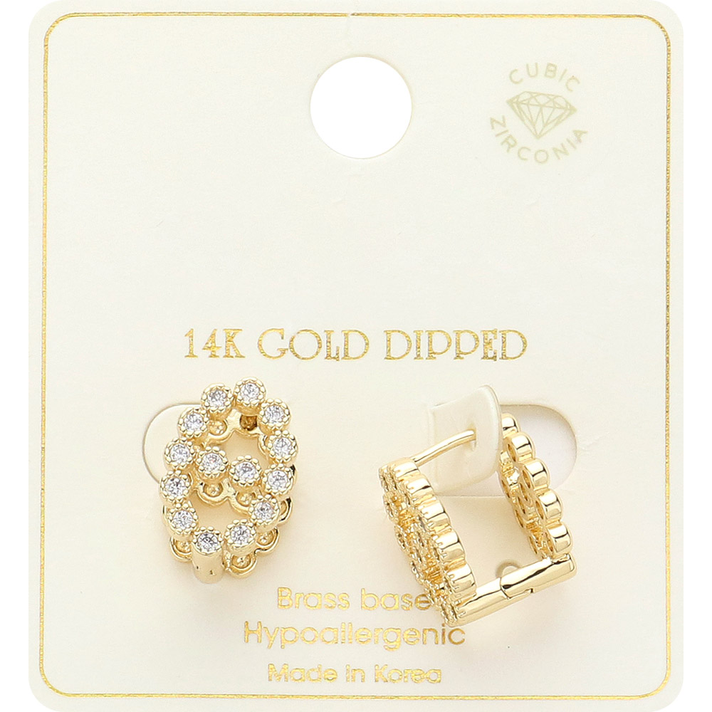 • Add timeless elegance to your style with sparkling huggie earrings encrusted with cubic zirconia. Featuring a 14K gold dipped finish and hypoallergenic comfort, these versatile earrings are perfect for everyday wear or dressing up for special occasions.