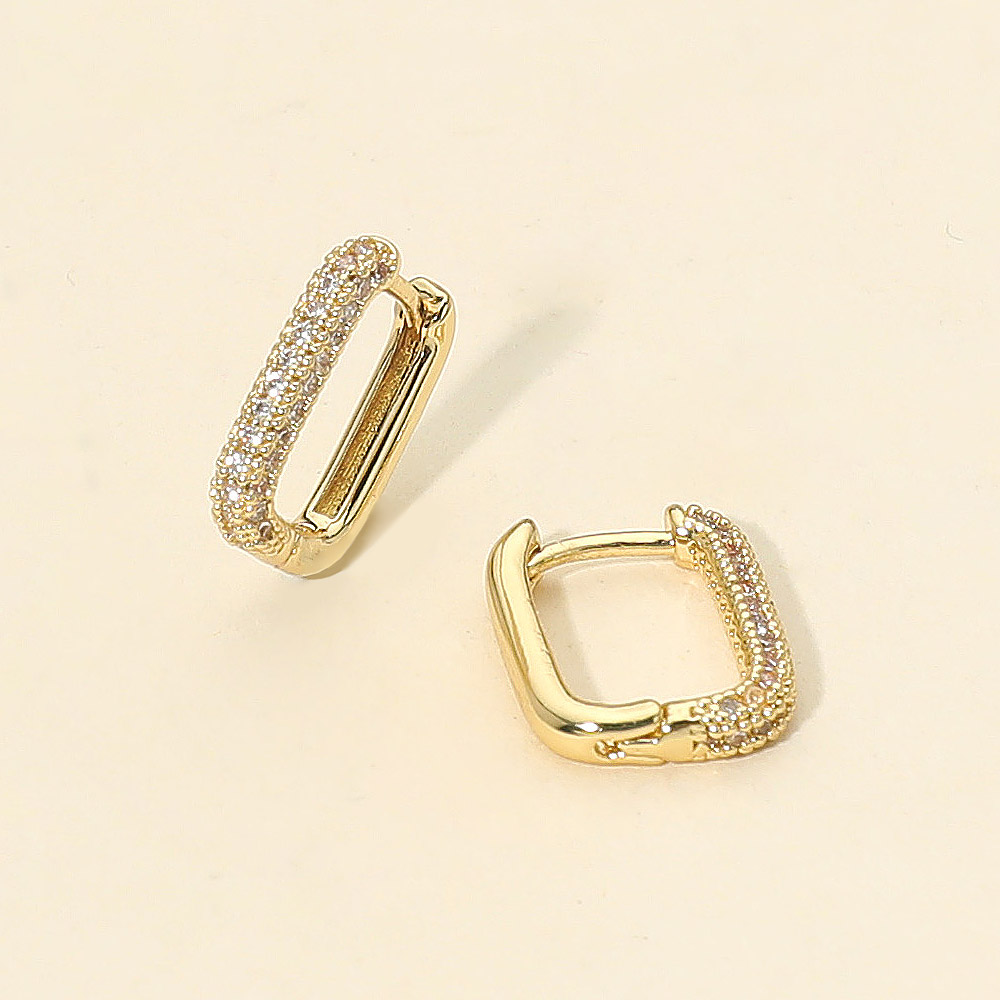 Details • Size : 0.4" X 0.6" • Huggie Back • Modern hoop earrings with a sleek geometric shape, enhanced by shimmering pave accents for a bold yet elegant look. A versatile accessory that adds refined sophistication to everyday wear and polished evening outfits. • Brass • CZ Cubic Zirconia • Gold Dipped • Hypoallergenic • Lead and Nickel Compliant • Made In Korea