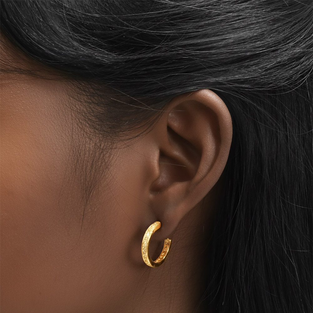Details • Size : 0.75" X 0.75" • Post Back • Timeless half hoop earrings adorned with delicate shimmering accents. Their elegant curve and refined sparkle make them the perfect choice for enhancing everyday outfits or adding sophistication to evening looks. • Brass • CZ Cubic Zirconia • Gold Dipped • Hypoallergenic • Lead and Nickel Compliant • Made In Korea