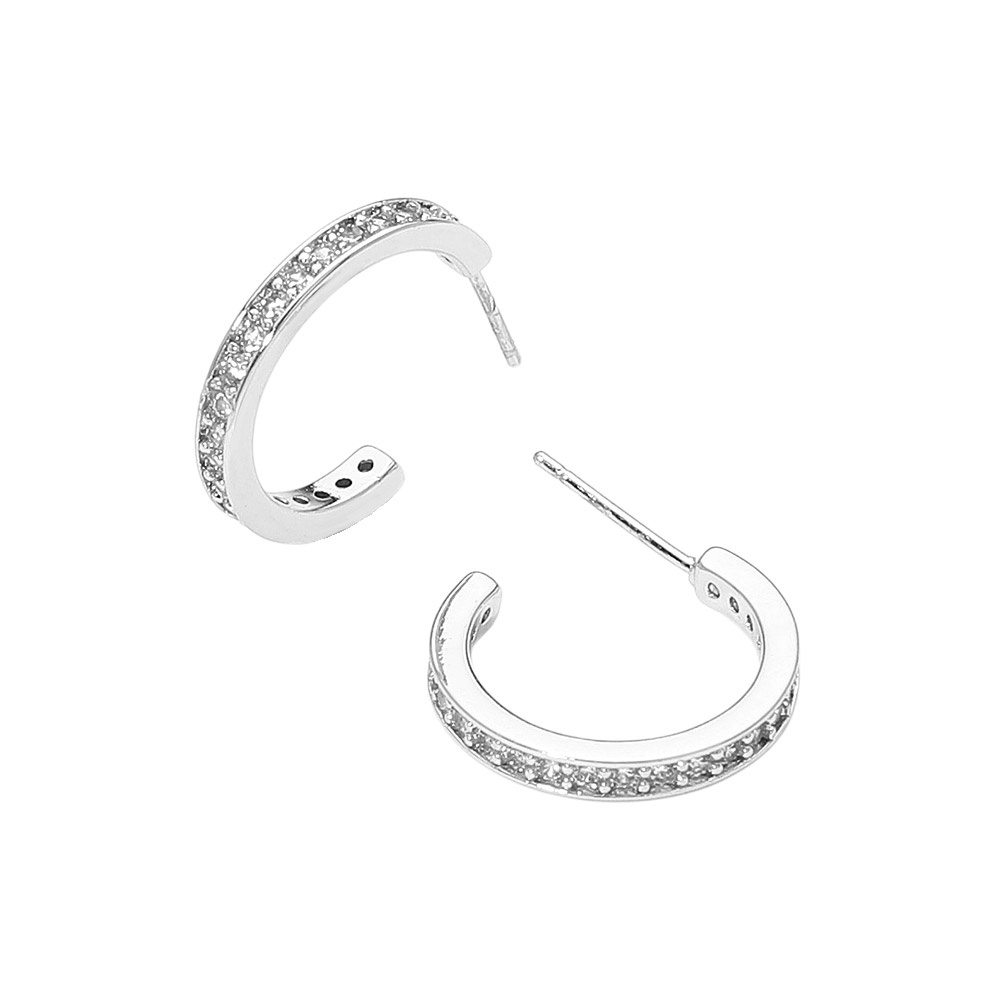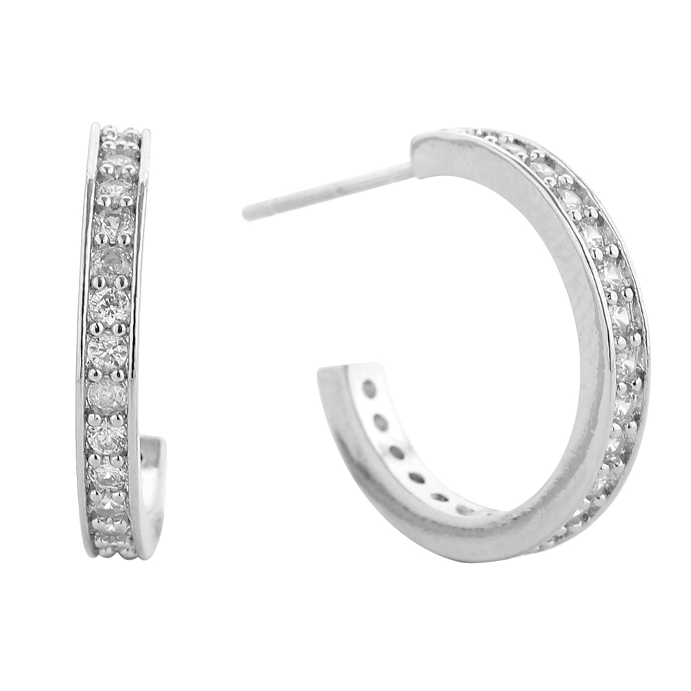 Details • Size : 0.75" X 0.75" • Post Back • Timeless half hoop earrings adorned with delicate shimmering accents. Their elegant curve and refined sparkle make them the perfect choice for enhancing everyday outfits or adding sophistication to evening looks. • Brass • CZ Cubic Zirconia • Gold Dipped • Hypoallergenic • Lead and Nickel Compliant • Made In Korea