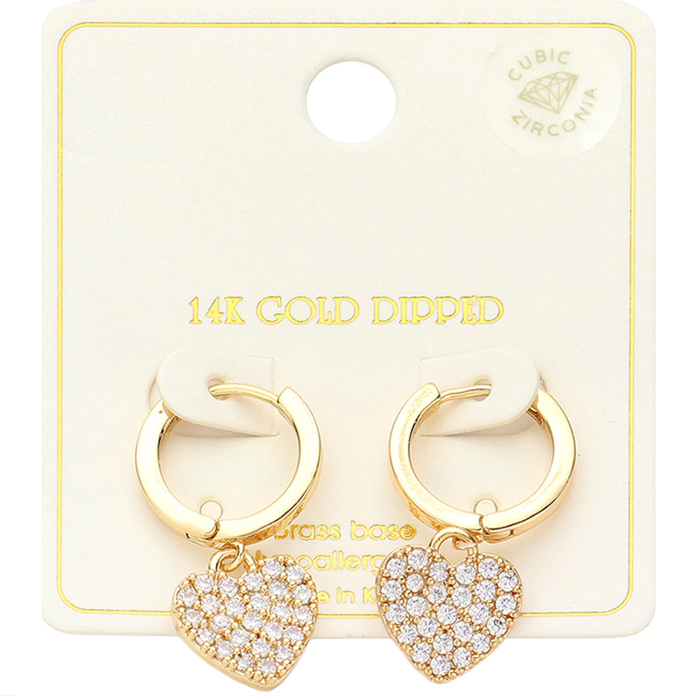 14K Gold Dipped CZ Stone Paved Radiant Heart Swing Dangle Huggie Earrings