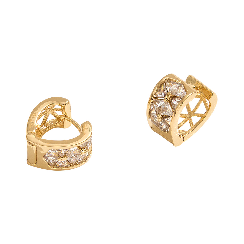 Details • Size : 0.6" X 0.5" X 0.3" • Huggie Back • Elevate your everyday style with these huggie hoop earrings, featuring bold square-cut CZ inlays that deliver a modern geometric sparkle. Designed for comfort and sophistication, they are the perfect choice for stacking or solo wear, adding instant shine to any look. • Brass • CZ Cubic Zirconia • Gold Dipped • Hypoallergenic • Lead and Nickel Compliant • Made In Korea