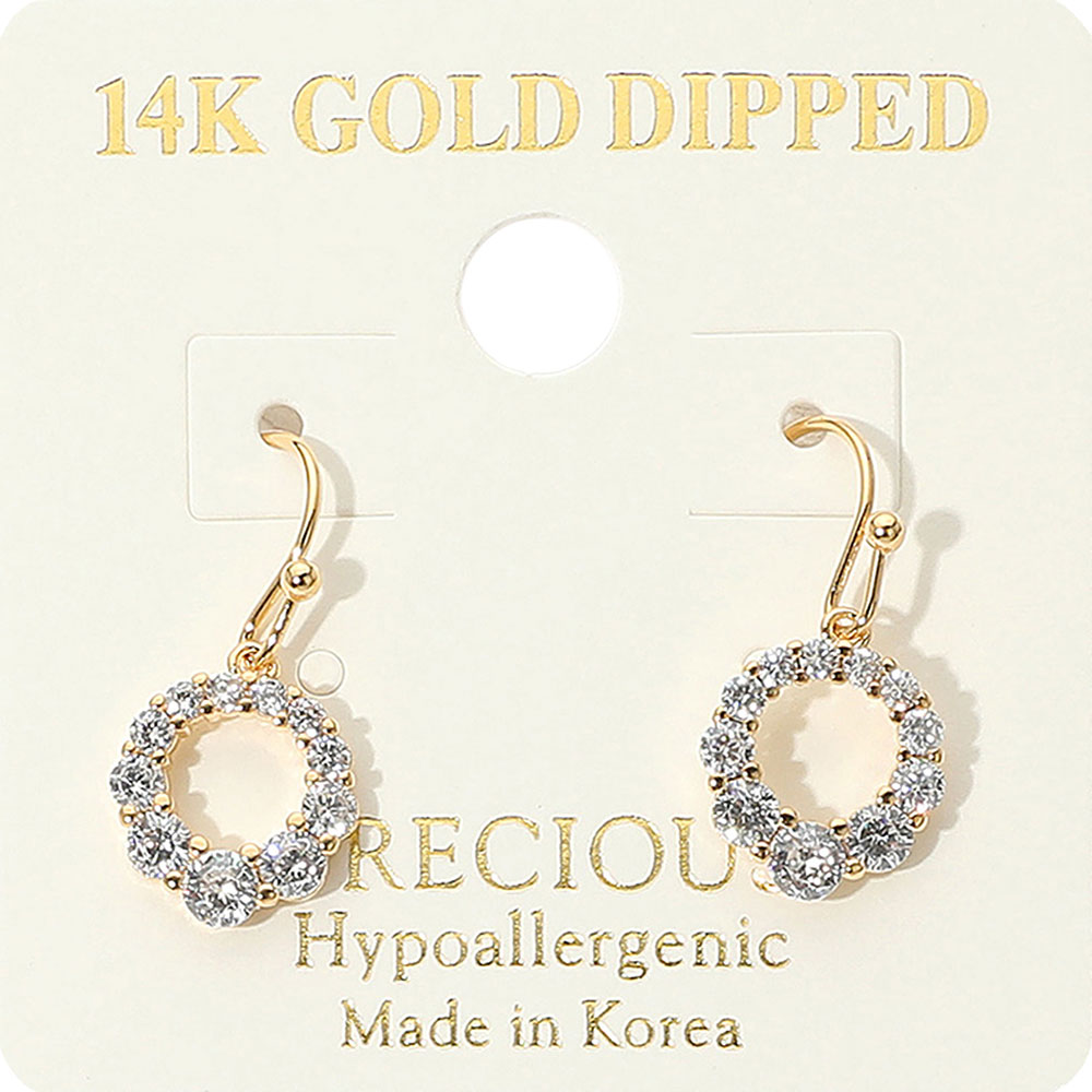 Details • Size : 0.4" X 0.9" • Fish Hook Back • These circle drop earrings feature a delicate open design adorned with shimmering stone accents for timeless elegance. Lightweight and hypoallergenic, they add a refined sparkle that enhances both everyday outfits and special occasion looks with sophisticated charm. • Gold Dipped • Hypoallergenic • Made In Korea