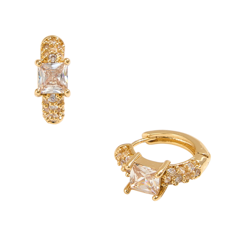Details • Size : 0.6" X 0.5" X 0.25" • Huggie Back • These hoop earrings feature a bold square-cut CZ centerpiece framed with smaller sparkling stones, creating a look that is both glamorous and refined. Perfect for adding brilliance to your outfit, they offer timeless elegance with a modern twist for any occasion. • Brass • CZ Cubic Zirconia • Gold Dipped • Hypoallergenic • Lead and Nickel Compliant • Made In Korea