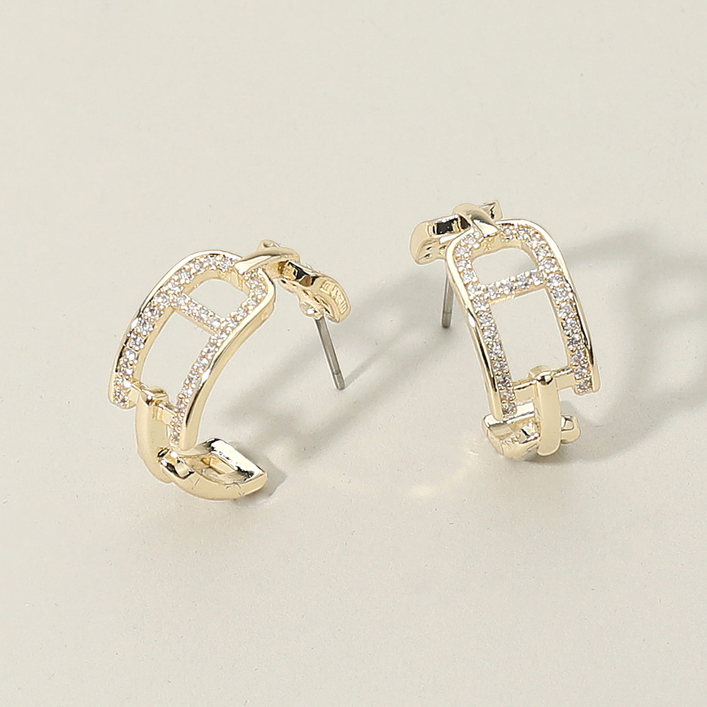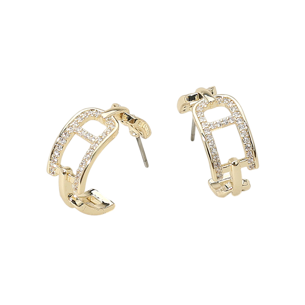 Details • Size : 0.8" X 0.8" X 0.3" • Post Back • Add modern elegance to your jewelry collection with these geometric hoop earrings featuring crystal accents. Their unique openwork design blends contemporary style with timeless sparkle, making them perfect for casual wear, evening looks, or gifting. • CZ Cubic Zirconia • Gold Dipped