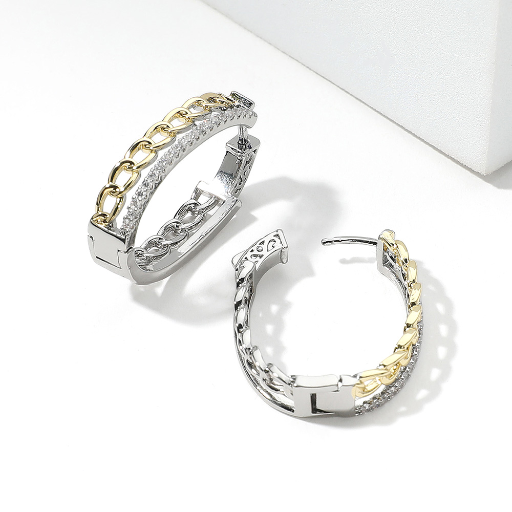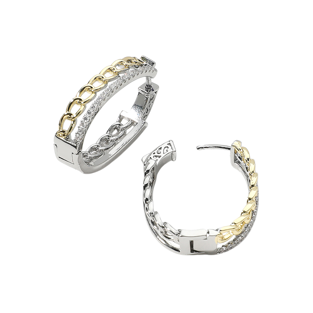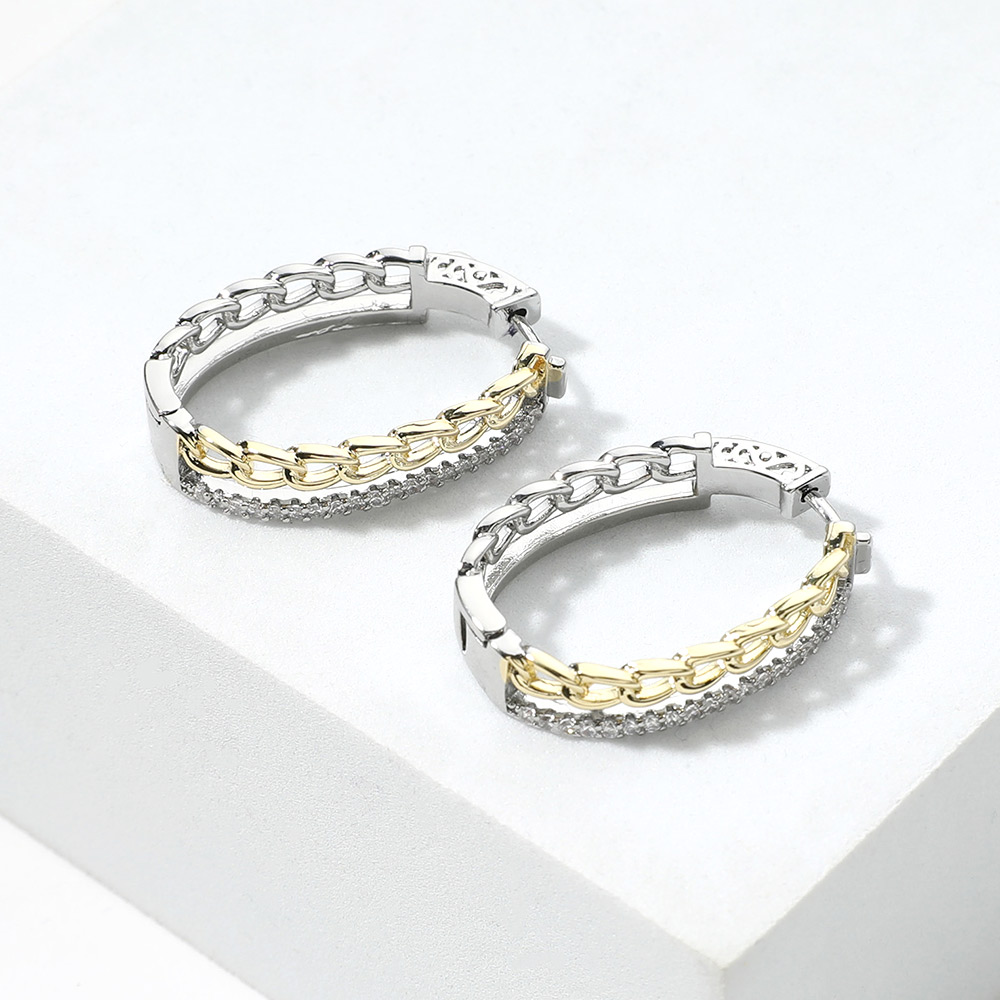 Details • Size : 0.8" X 1.25" X 0.25" • Huggie Back • These hoop earrings feature a bold chain link design with dual-tone detailing and sparkling crystal accents. Perfect for adding a touch of edge and elegance, they elevate everyday looks and special occasions alike. A stylish, modern accessory for standout appeal. • Gold Dipped • CZ Cubic Zirconia