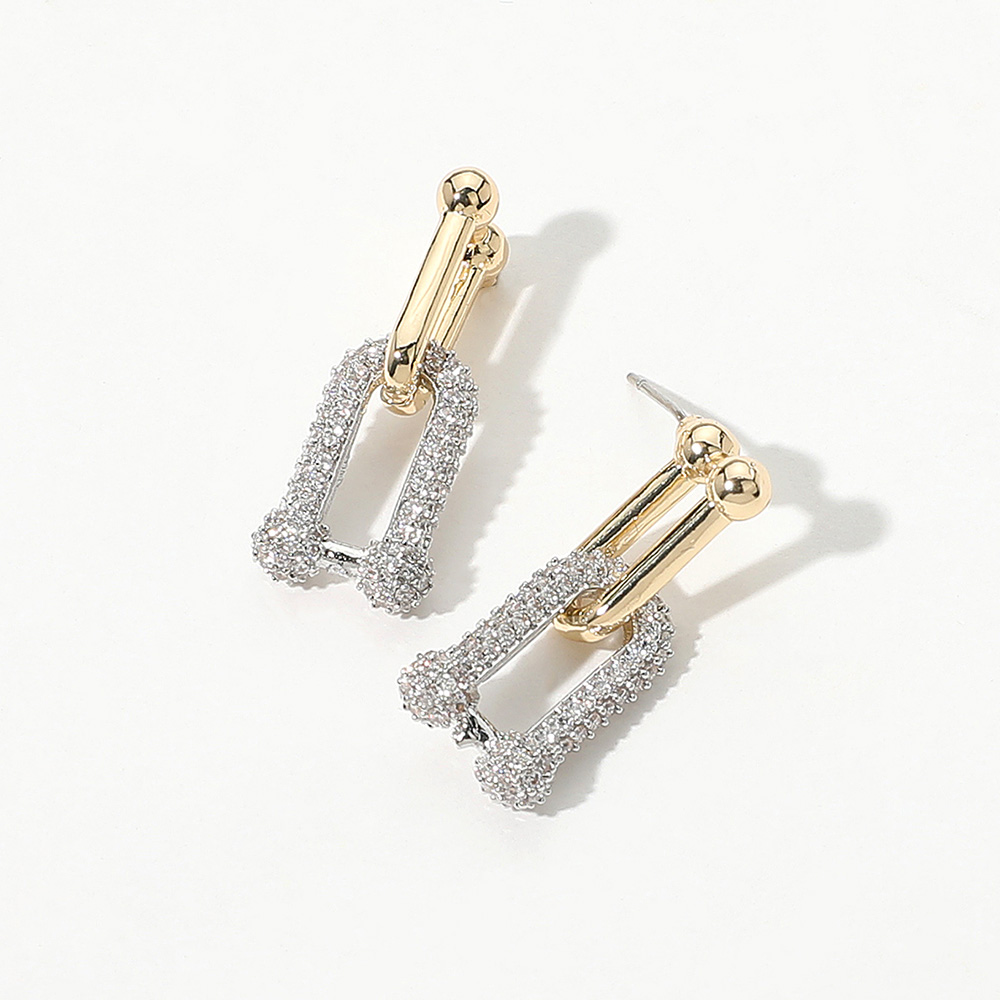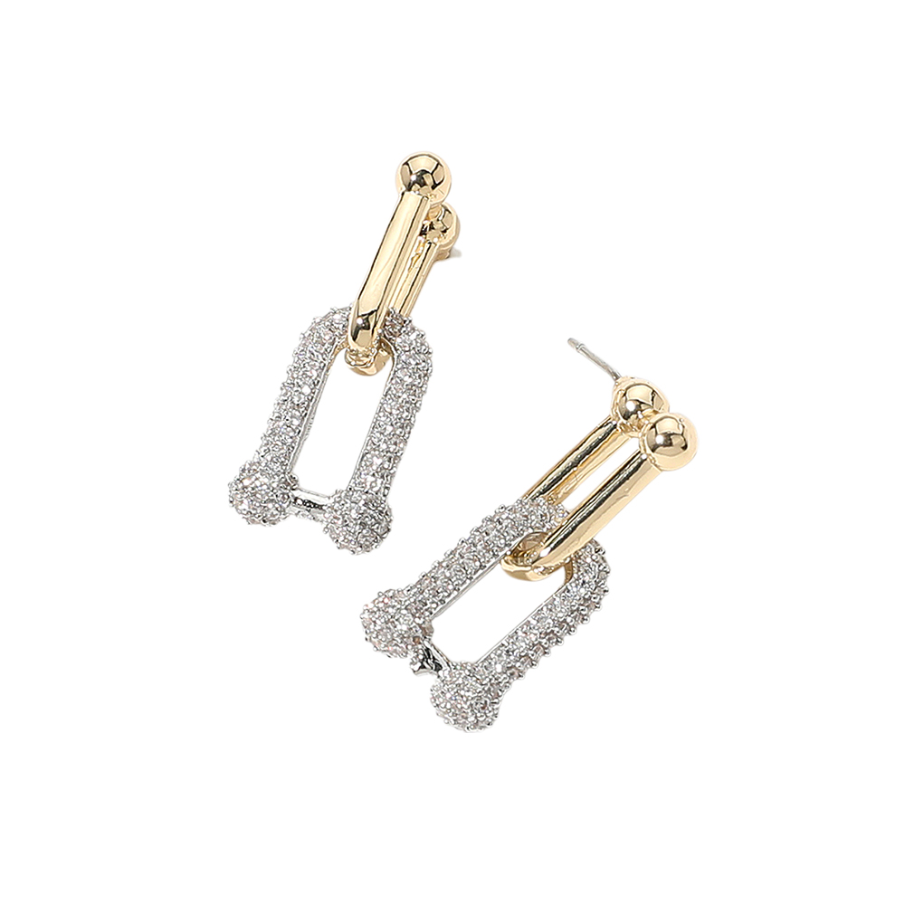 14K Gold Plated Two Tone CZ Stone Paved Hardware Chain Link Earrings