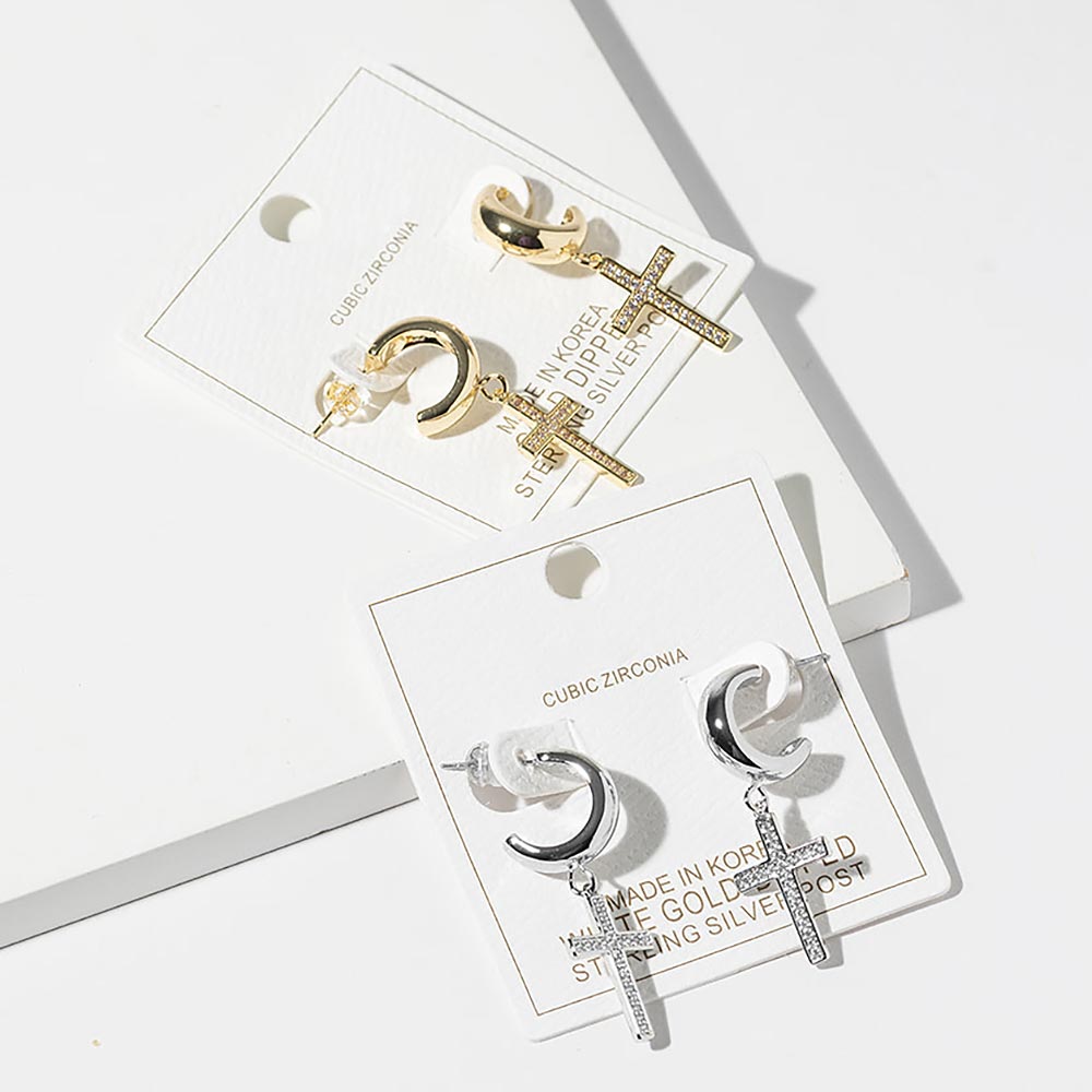 • Stylish cross drop hoop earrings designed with a smooth curved hoop and a sparkling pavĂ© cross charm. This modern yet timeless design adds meaningful detail and visual interest, making it ideal for everyday wear, layered looks, or curated boutique jewelry collections focused on trend-forward elegance.