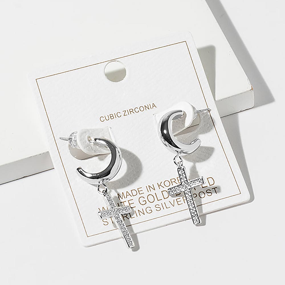 White Gold Dipped CZ Stone Paved Cross Drop Dangle Mini Hoop Earrings