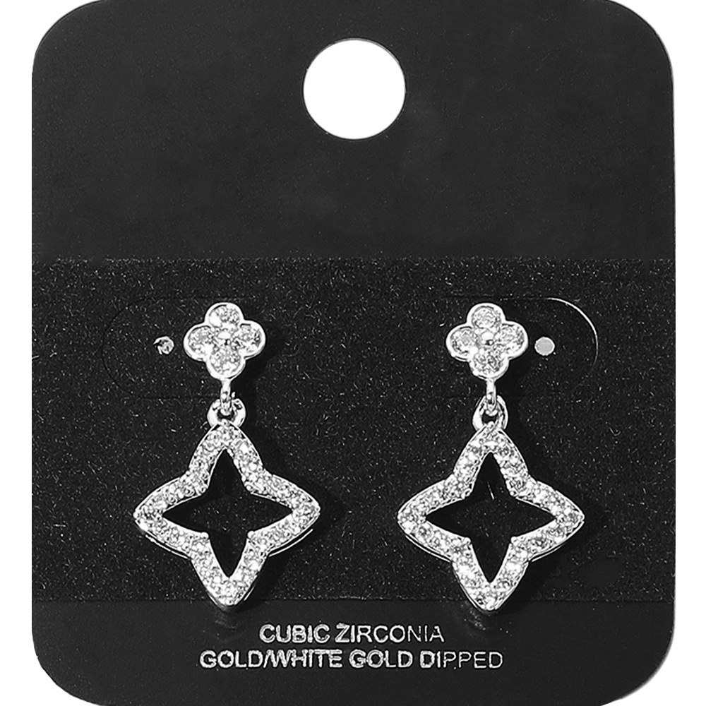 Gold Dipped CZ Stone Paved Quatrefoil Open Clover Dangle Earrings