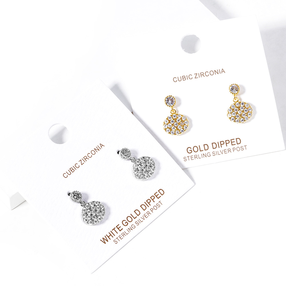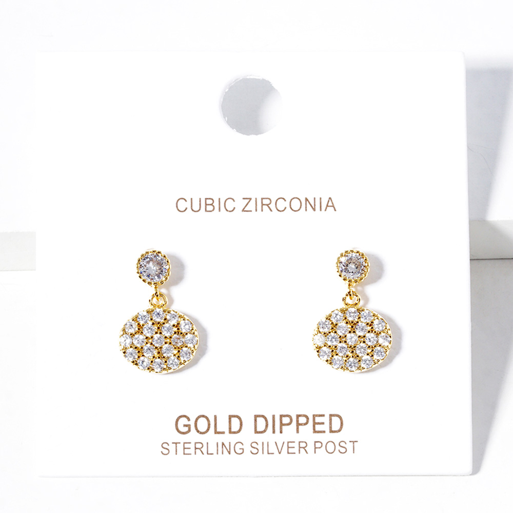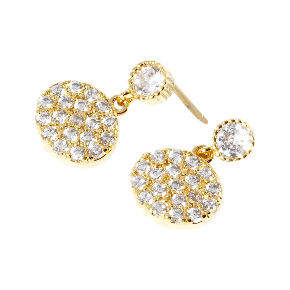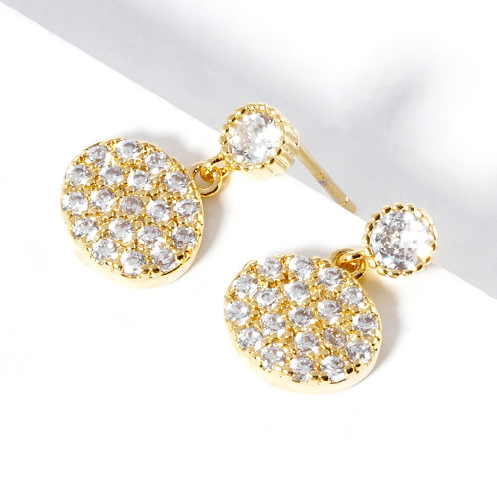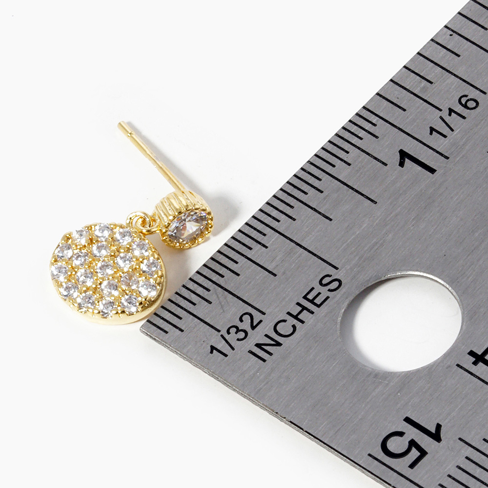 Gold Dipped CZ Stone Paved Round Disc Dangle Earrings