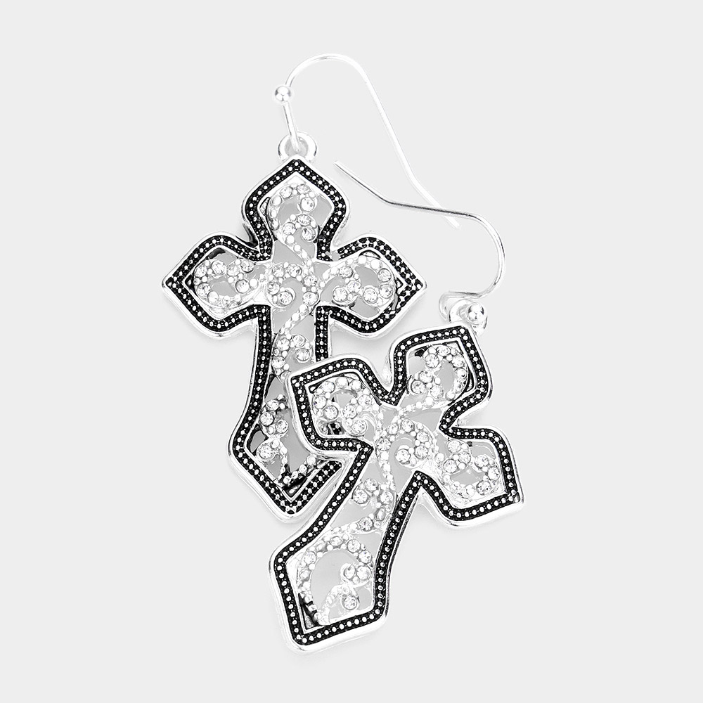 Rhinestone Embellished Metal Cross Dangle Earrings