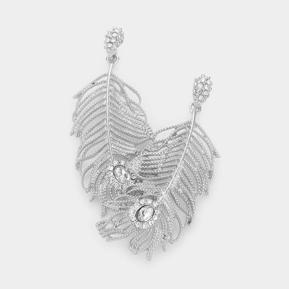 Rhinestone Embellished Metal Feather Dangle Earrings