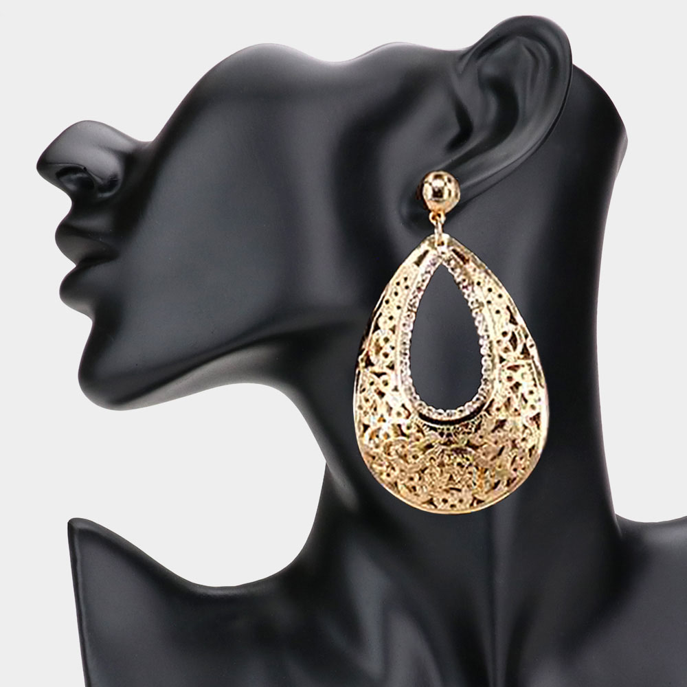 Rhinestone Embellished Metal Filigree Teardrop Dangle Earrings