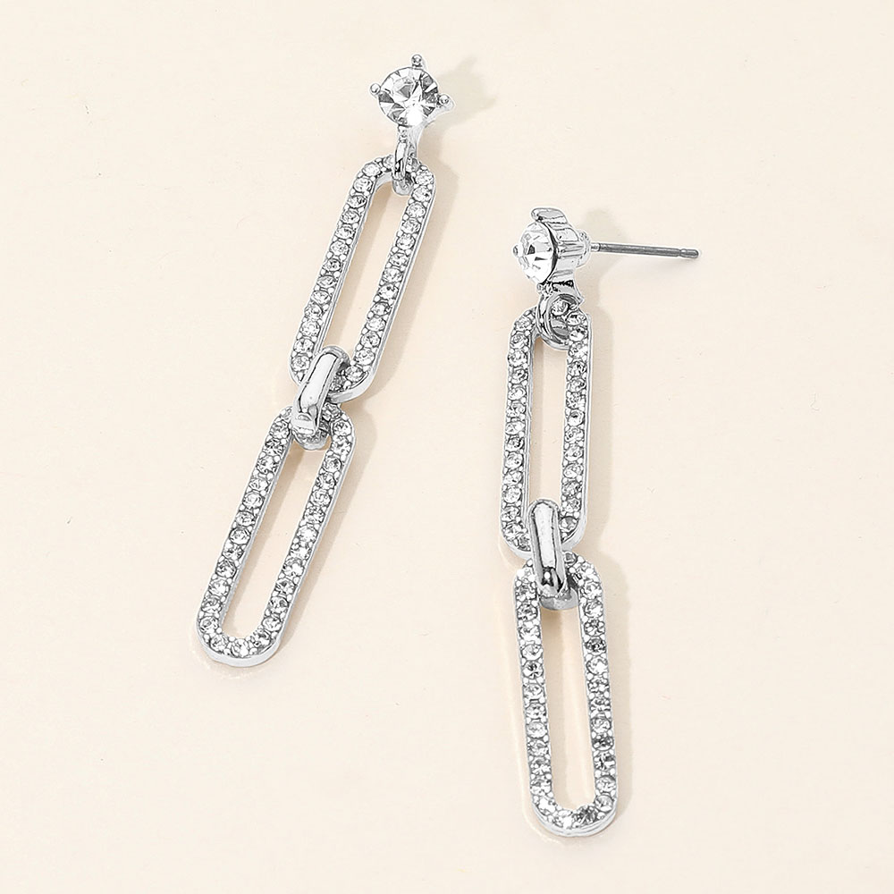 Details • Size : 0.3" X 2.4" • Post Back • Turn up the sparkle with these rhinestone chain link drop earrings, designed with interlocking links that shimmer beautifully with every movement. Perfect for both casual chic and evening glamour, they bring a refined, modern edge to any jewelry collection. • Lead and Nickel Compliant