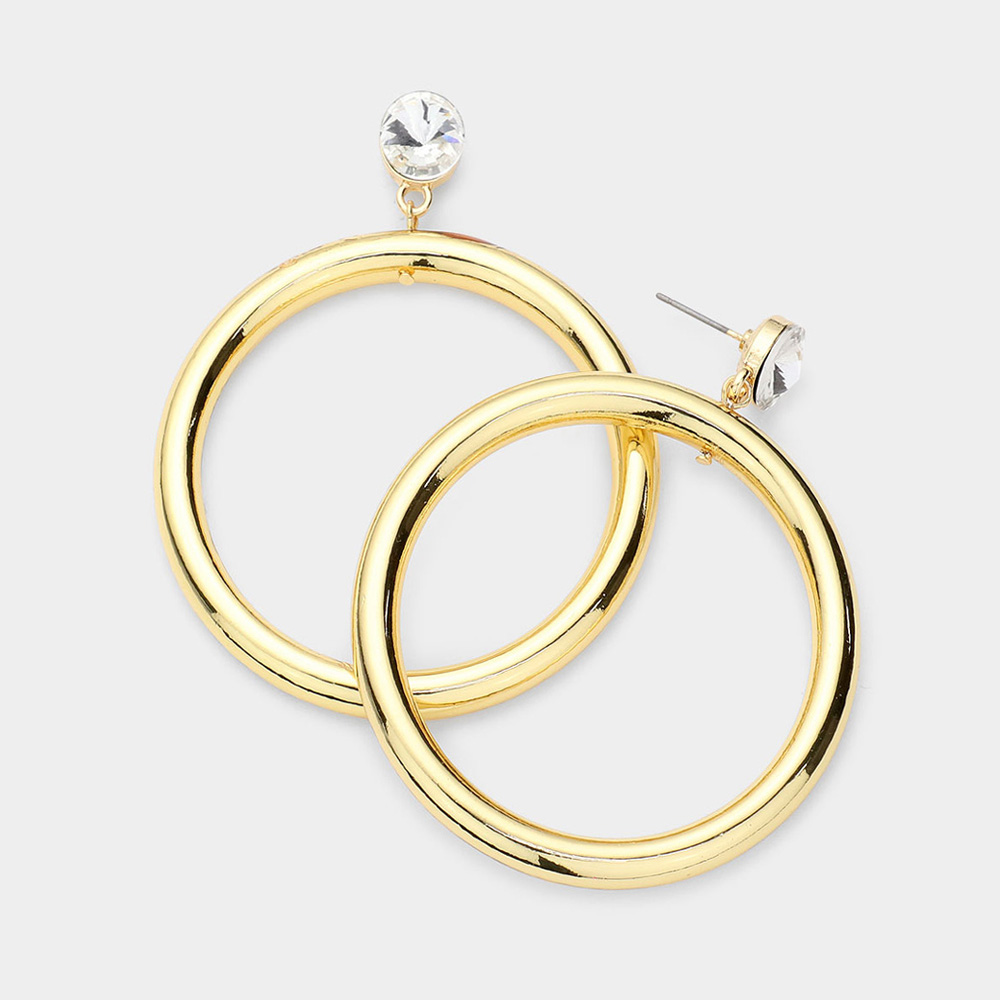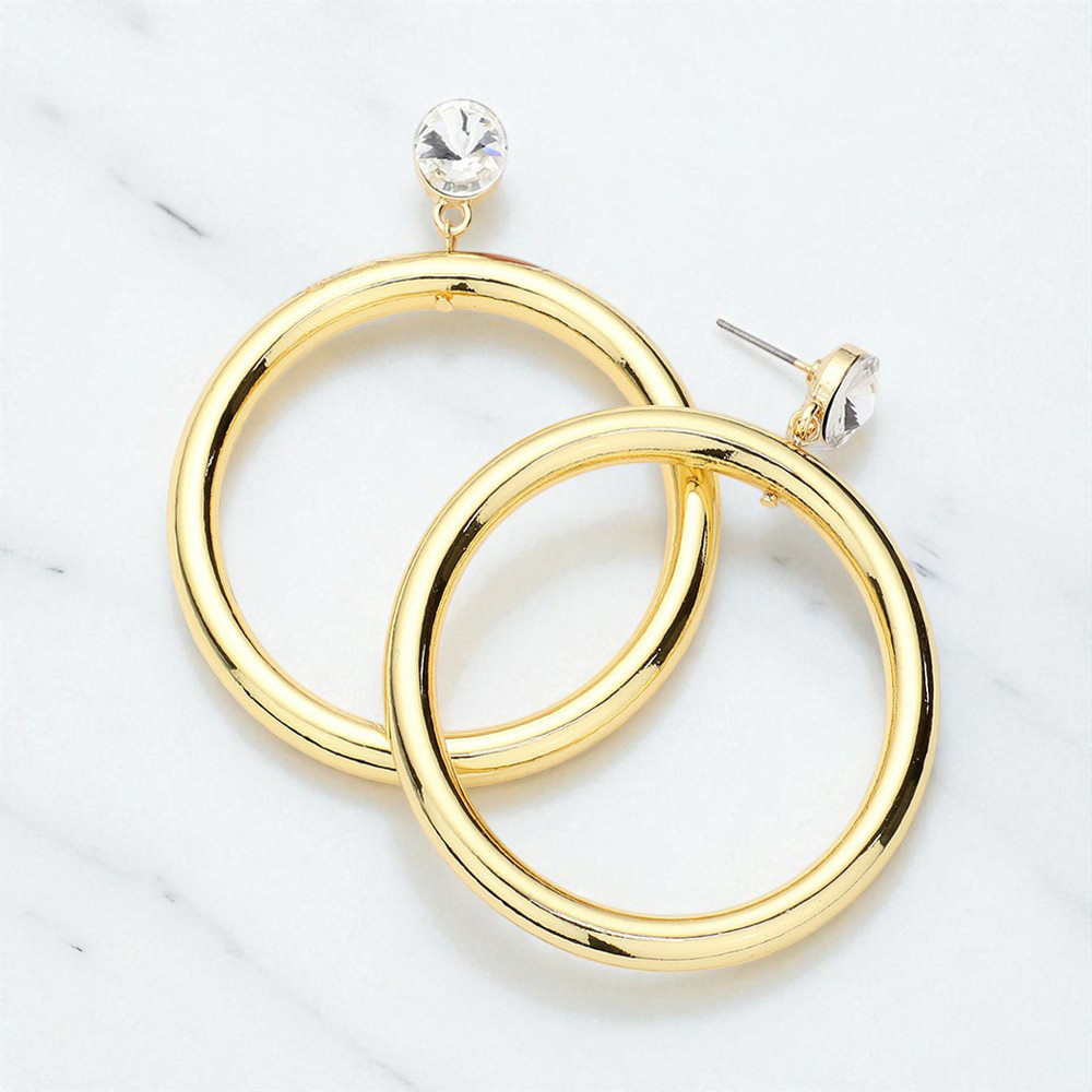 Details • Size : 2.25" X 3" • Post Back • These large hoop earrings combine timeless elegance with a modern edge, featuring a sleek circular design suspended from sparkling crystal studs. Lightweight yet bold, they add effortless glamour to any outfit, perfect for both casual chic and evening sophistication. • Lead and Nickel Compliant