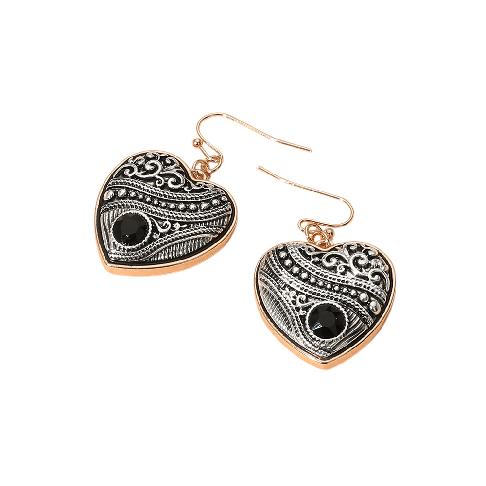 Round Stone Pointed Antique Metal Heart Dangle Earrings Round Stone Pointed Antique Metal Heart Dangle Earrings