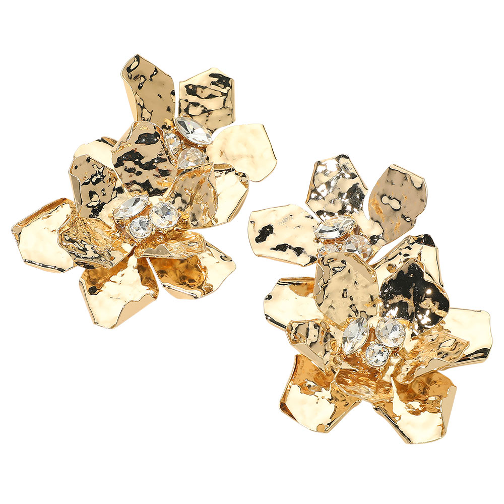 Details • Size : 2.5" X 3.5" • Post Back • These hammered metal floral statement earrings showcase a bold, sculptural design with textured petals and sparkling crystal accents. Their eye-catching style adds glamour and sophistication, making them a perfect accessory for weddings, parties, or standout everyday looks. • Lead and Nickel Compliant