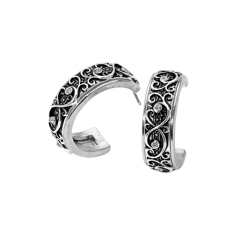 Stone Accented Antique Metal Filigree Hoop Earrings
