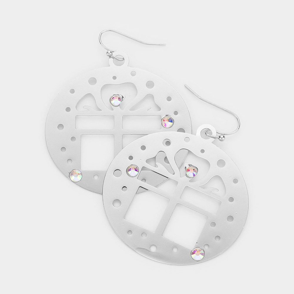 Stone Embellished Cutout Christmas Gift Brass Metal Round Dangle Earrings