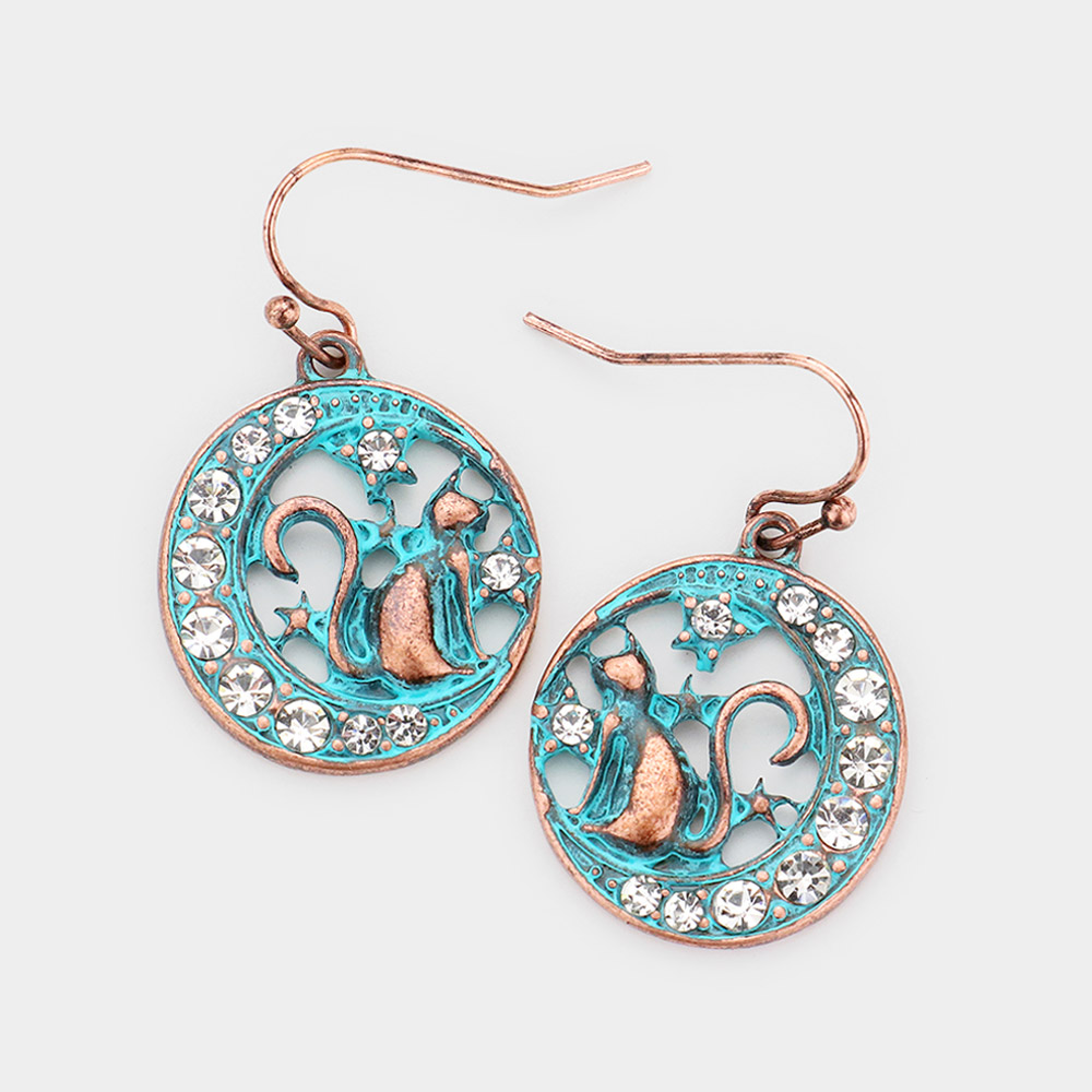 Stone Embellished Metal Cat on Crescent Moon Dangle Earrings