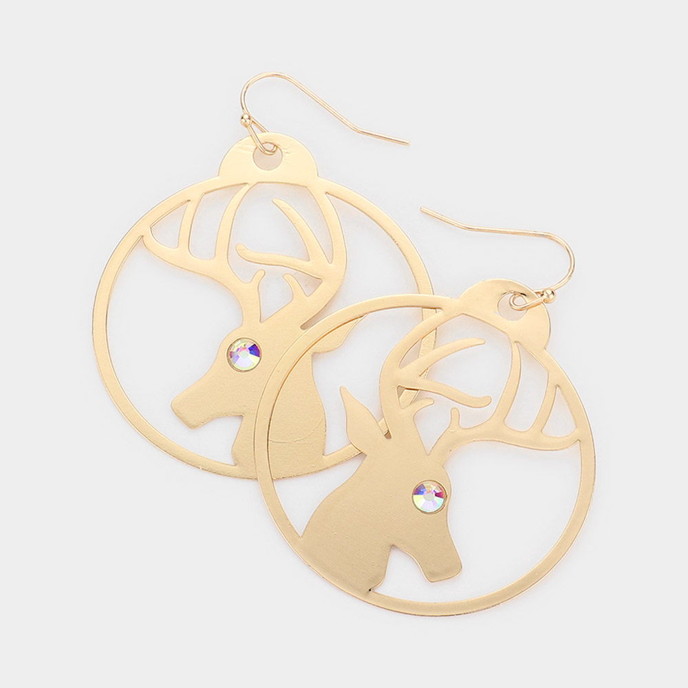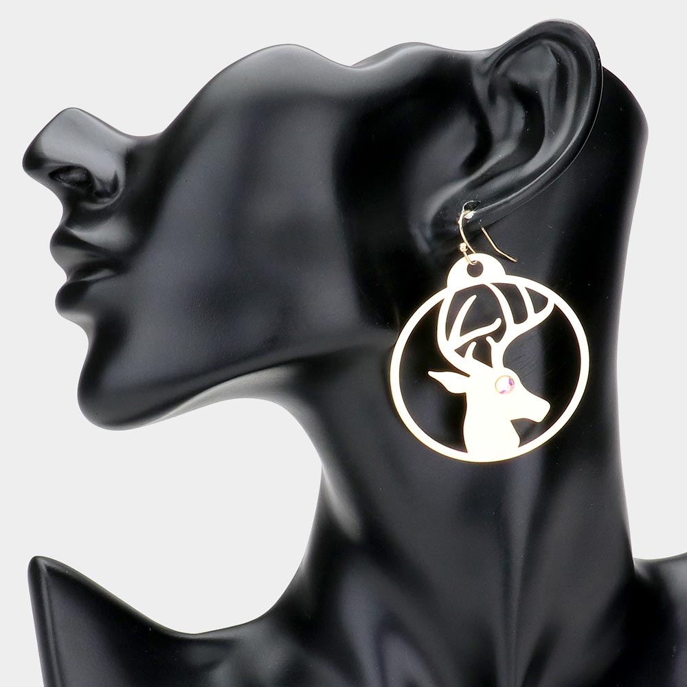 Stone Embellished Rudolph Accented Brass Metal Round Dangle Earrings