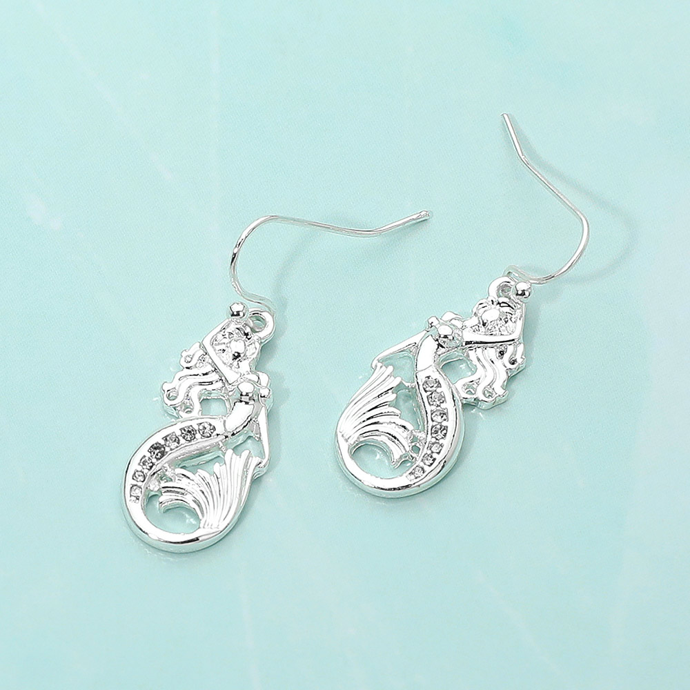• Whimsical mermaid dangle earrings featuring flowing lines and graceful movement that capture an ocean inspired fantasy look. A charming accessory for beach boutiques, resort shops, summer styling, gift stores, and coastal themed jewelry collections seeking playful yet elegant appeal.
