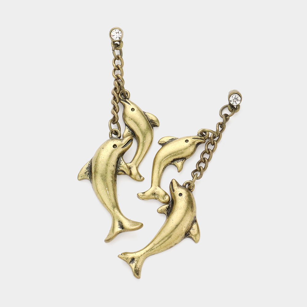 Stone Pointed Metal Dolphin Link Dangle Earrings