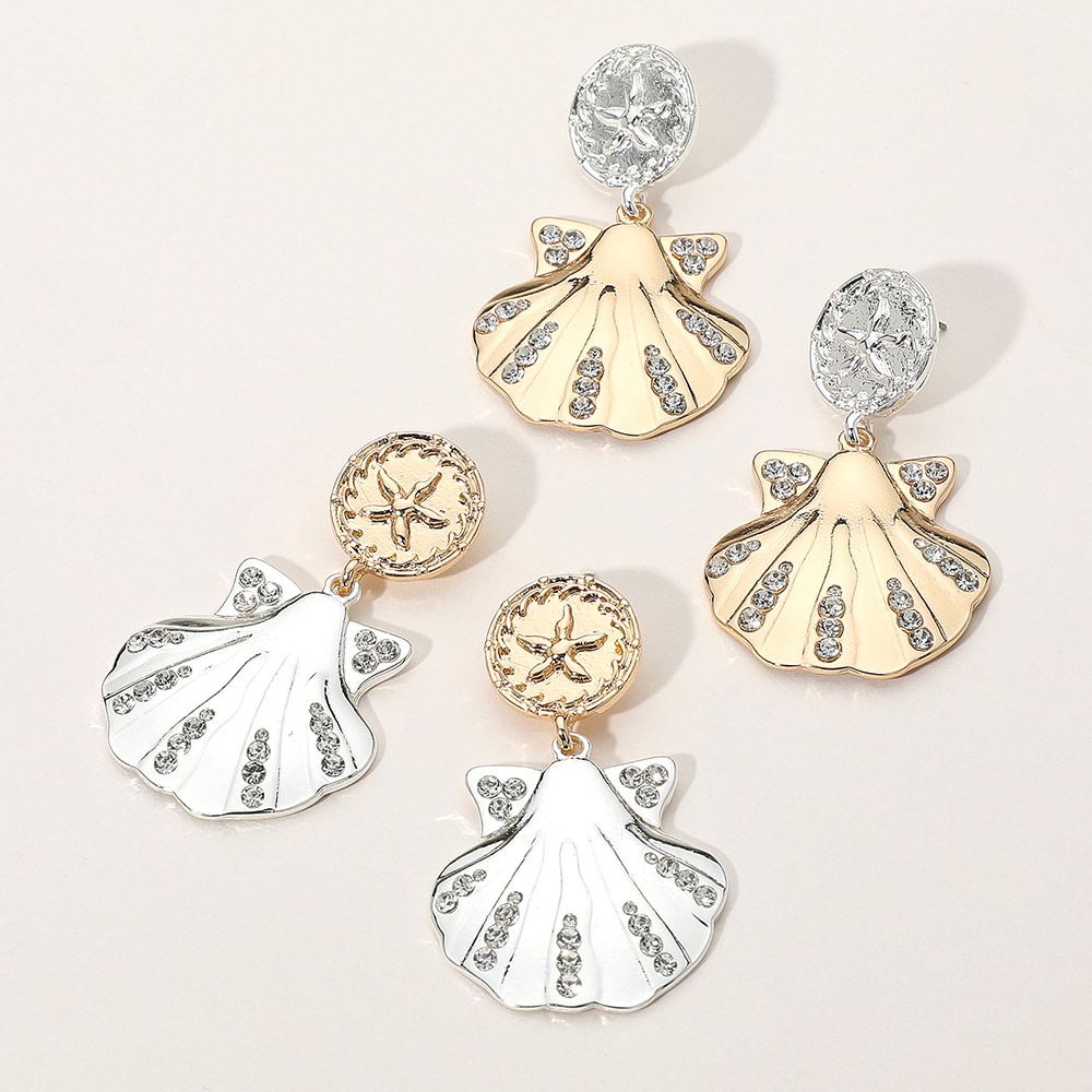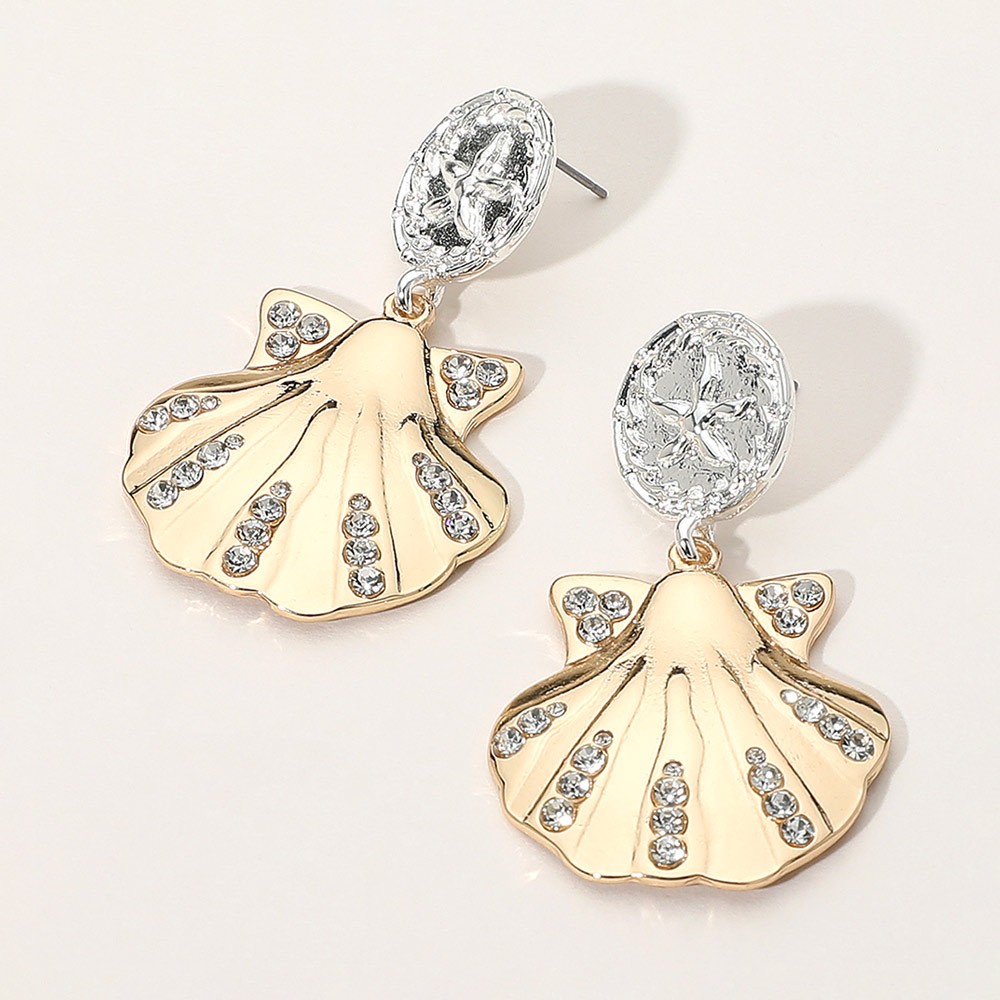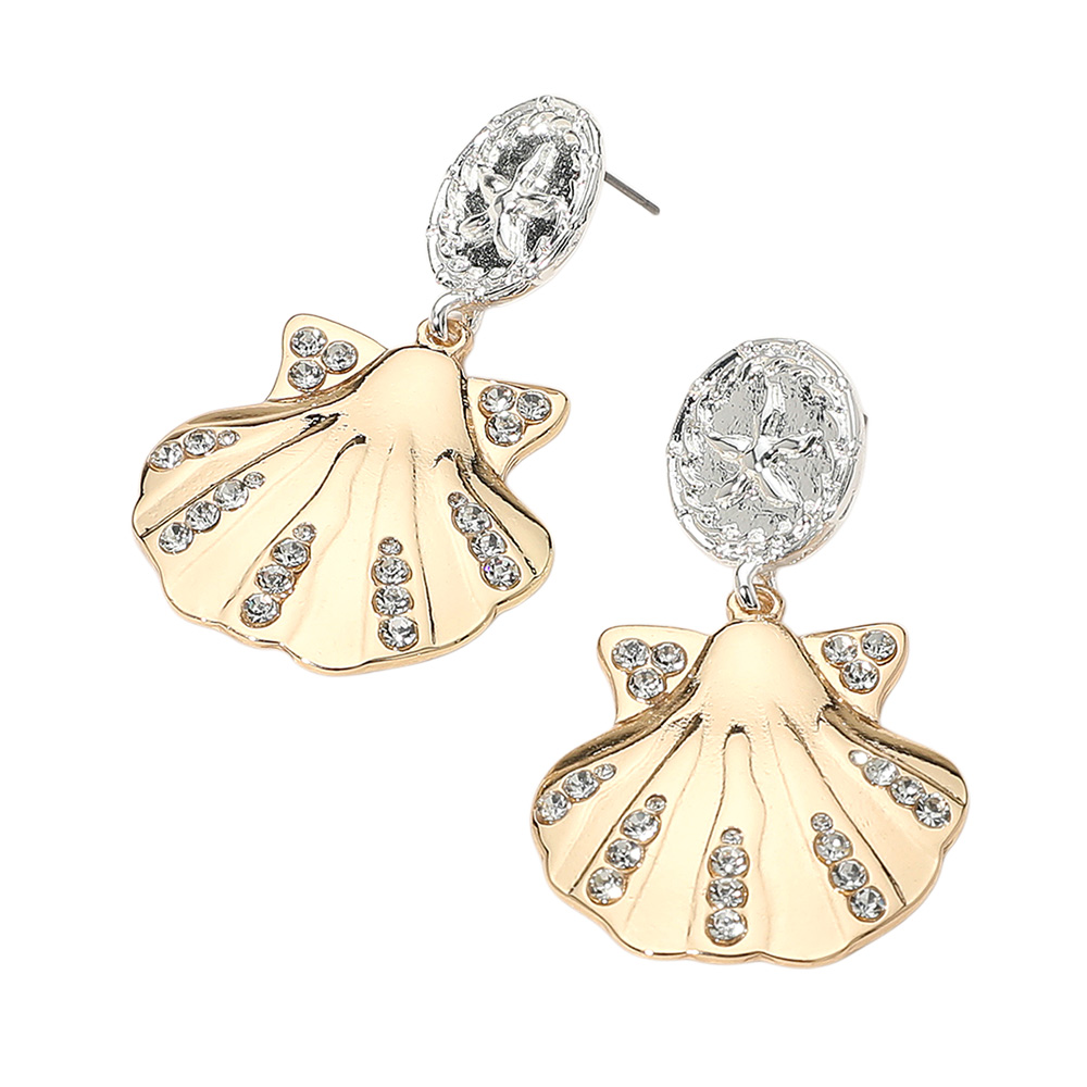 Two Tone Sand Dollar Pointed Stone Paved Sea Shell Dangle Earrings
